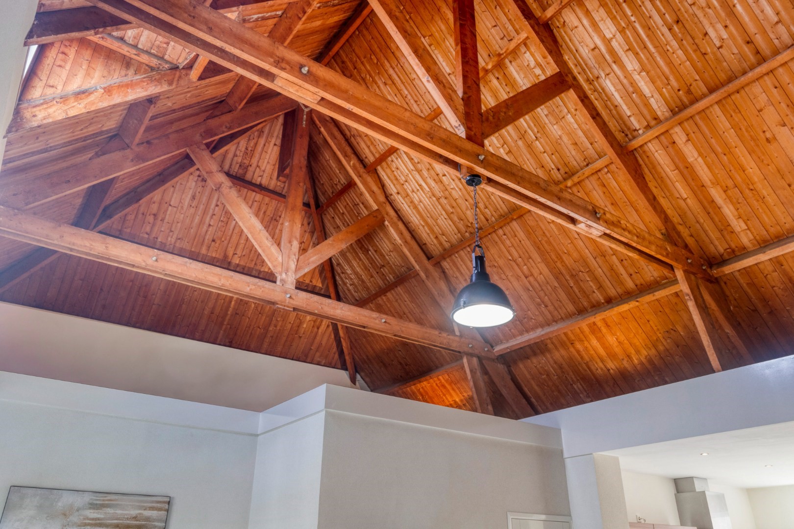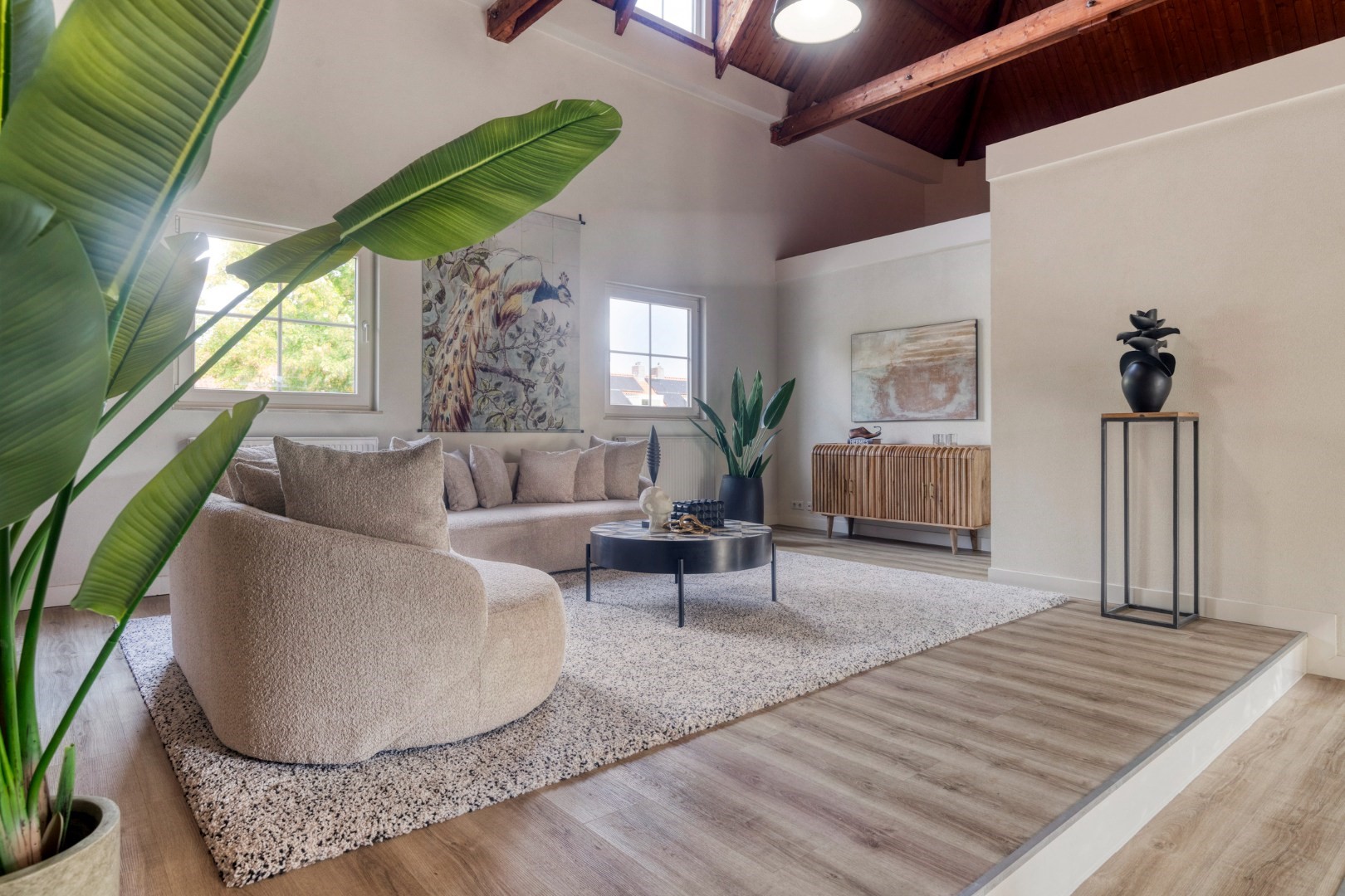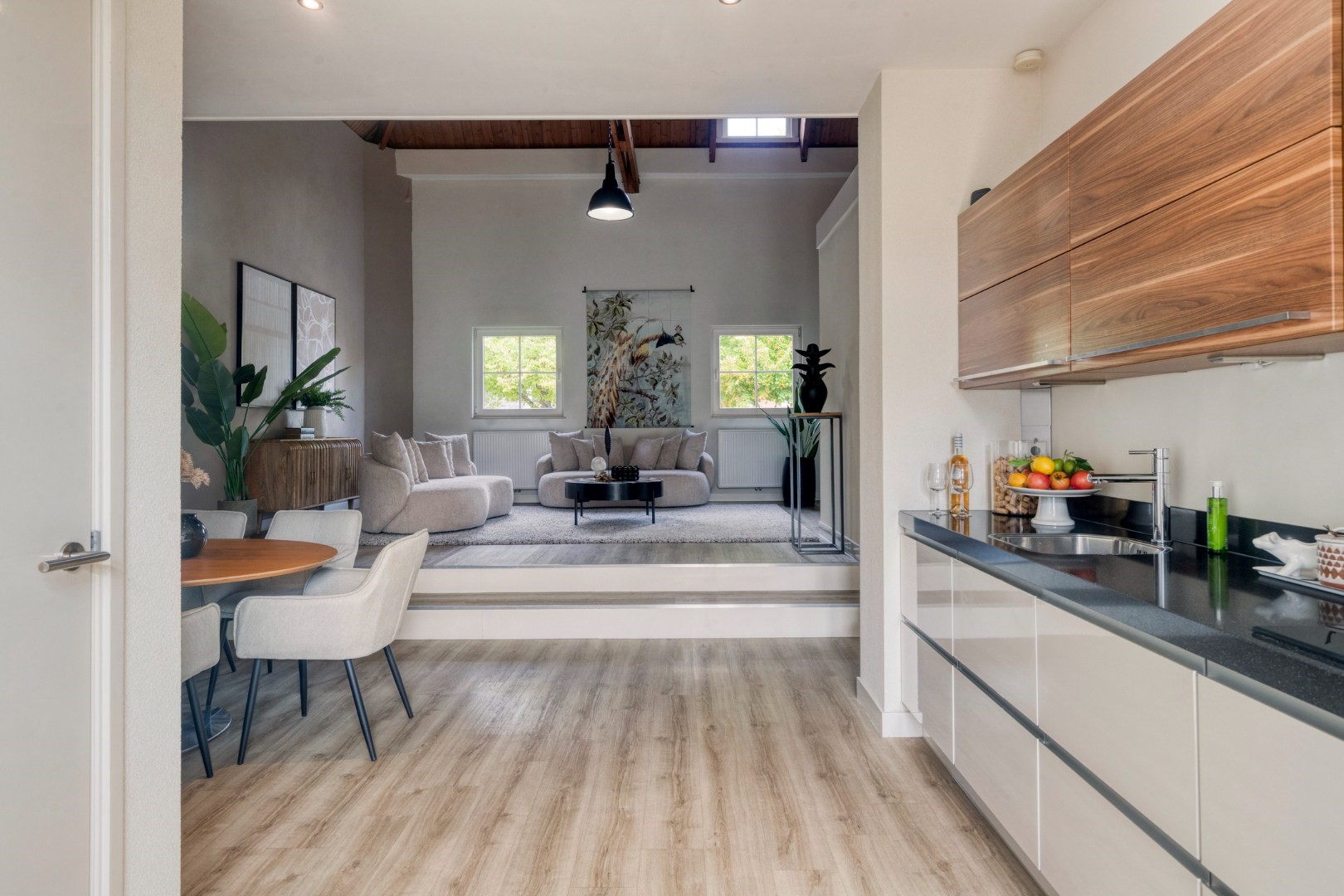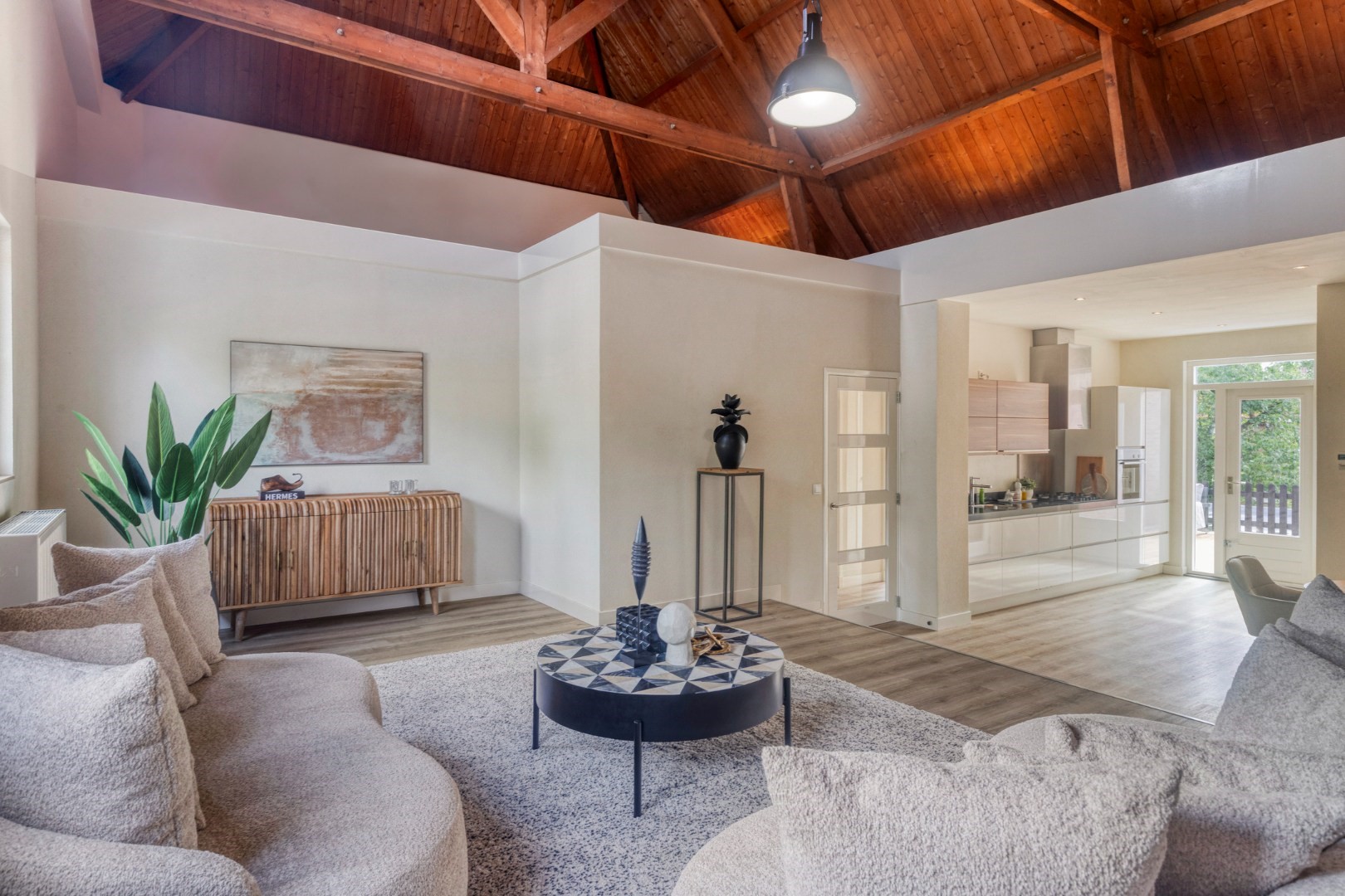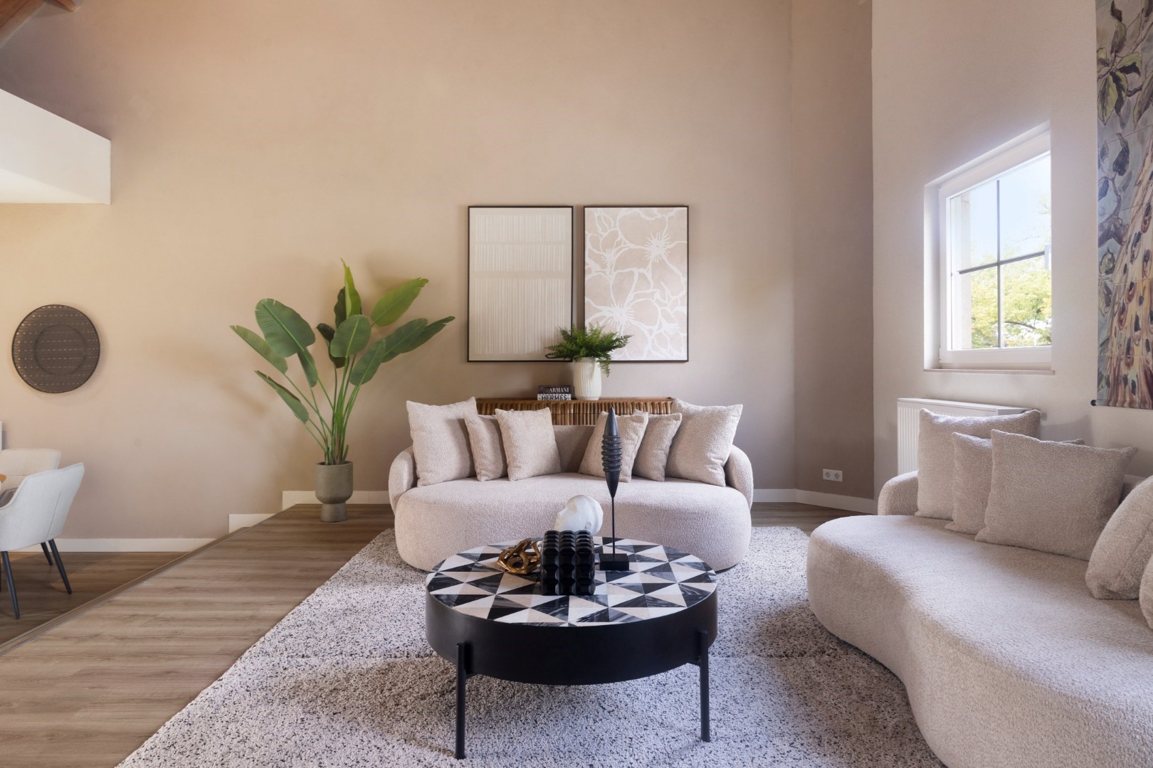 Via een klein trapje bereik je de lichte en verrassend hoge woonkamer. De hoge nok en het zicht op de fraaie, karakteristieke balken geven deze ruimte veel charme. Een kleine dakkapel zorgt voor extra lichtinval. In de woonkamer is ook een gezellige televisienis gecreëerd.