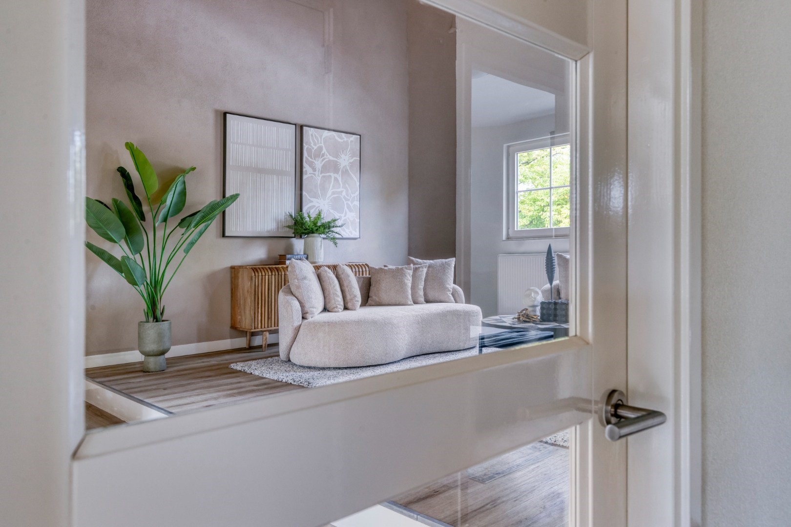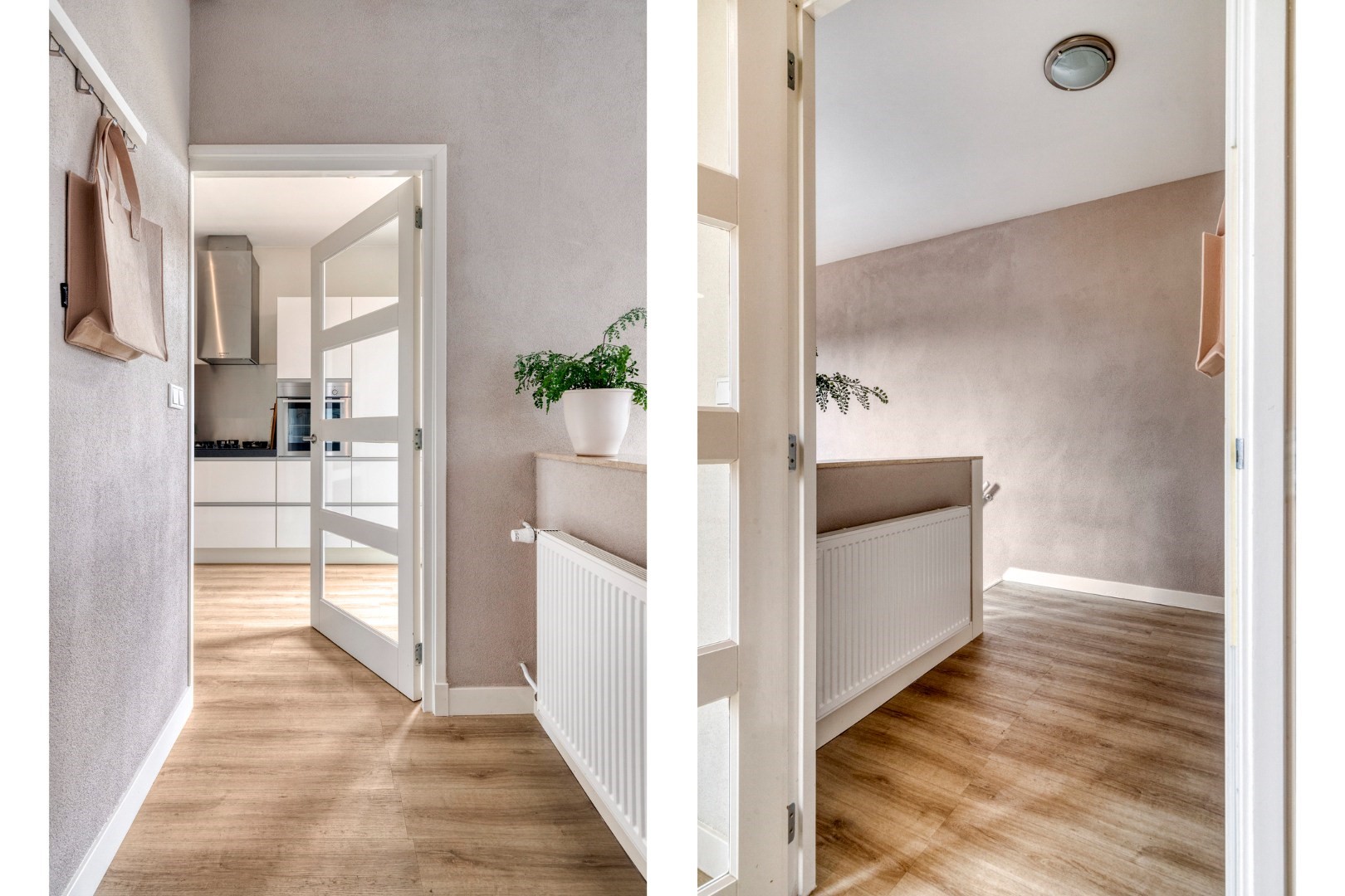 Via de oprit bereik je zowel de gezamenlijke overkapping voor fietsen als de eigen voordeur van het appartement. De royale hal, voorzien van een nette tegelvloer, biedt toegang tot een trapkast en een praktische berging. In de trapkast bevindt zich de moderne groepenkast. Daarnaast beschikt de begane grond over een zeer royale berging. Deze ruimte is uitermate geschikt voor het opbergen van seizoensspullen, gereedschap, voorraad of andere zaken die je graag uit het zicht houdt.