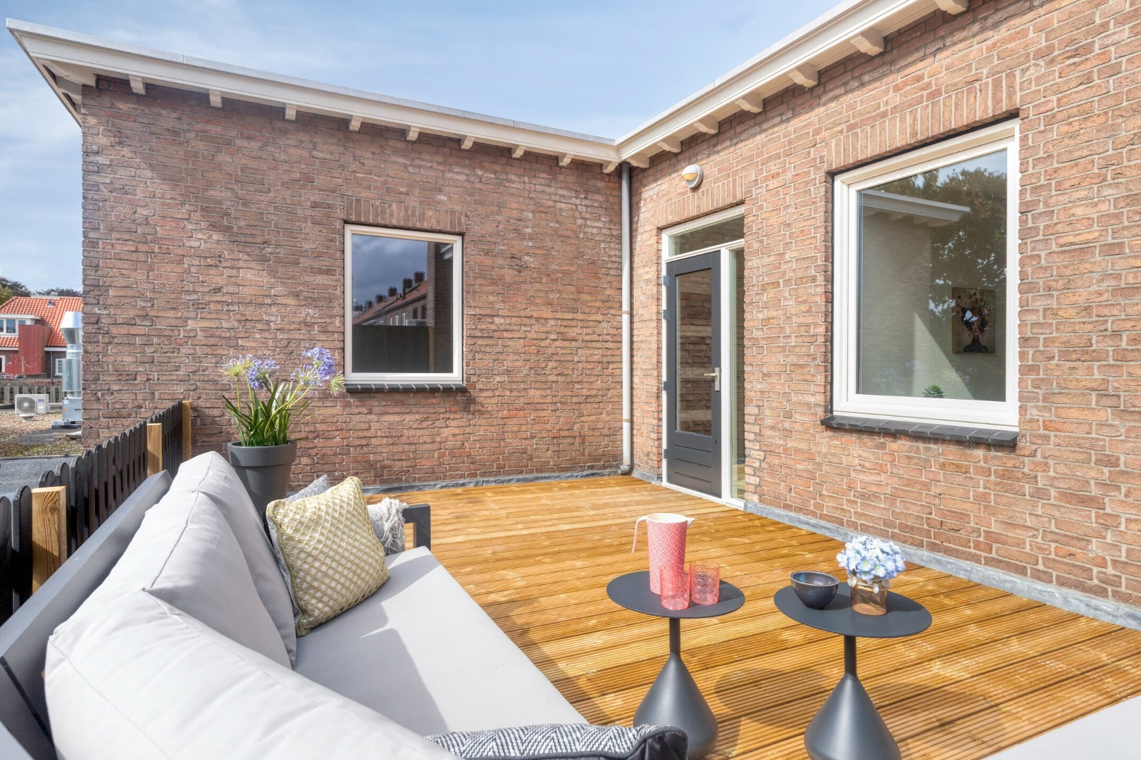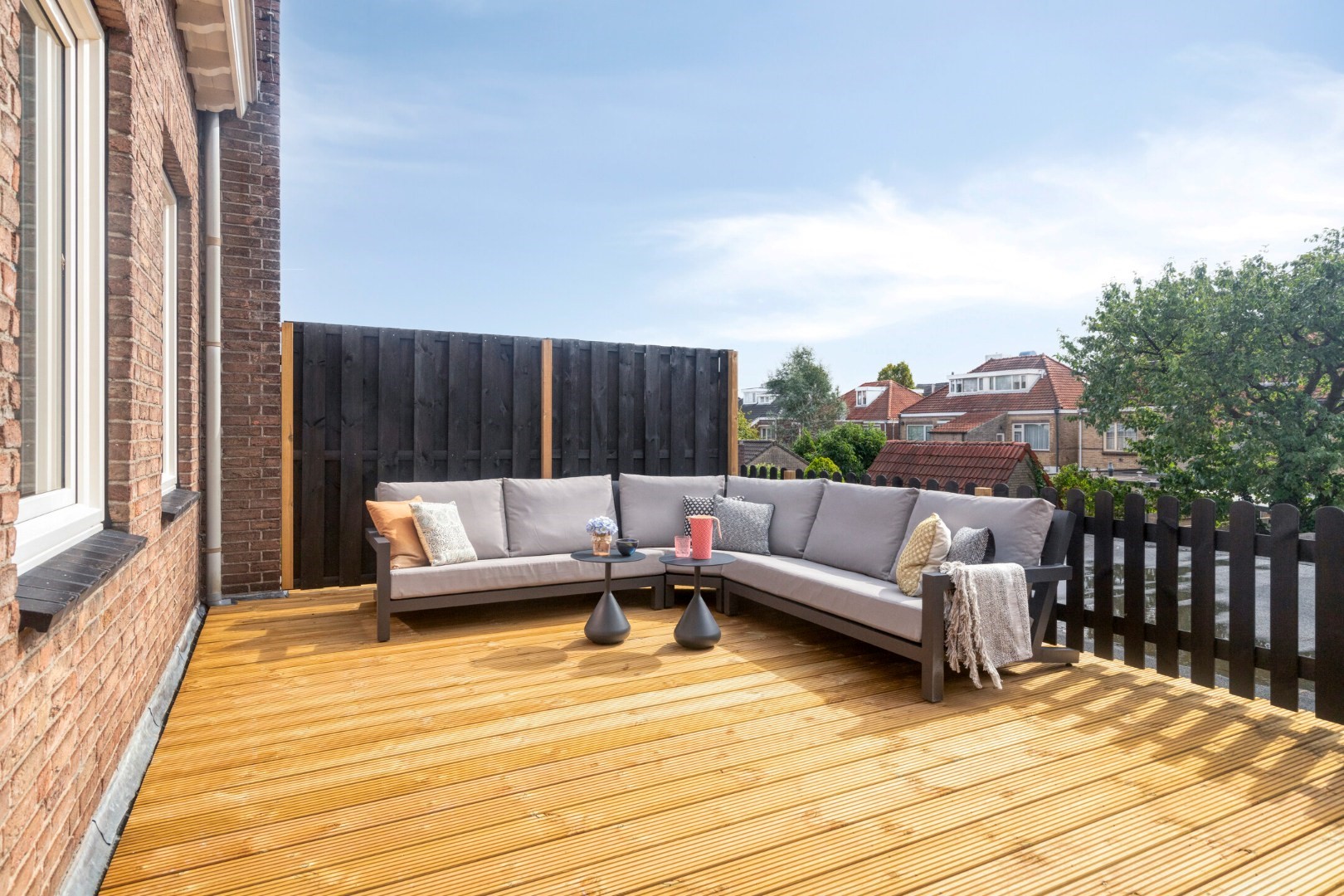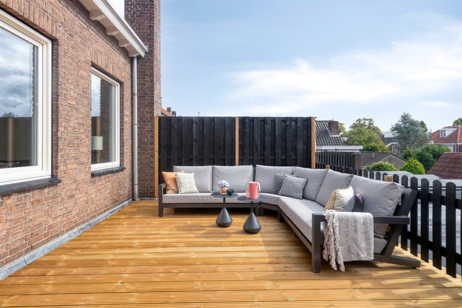 Direct grenzend aan de keuken bevindt zich de toegang tot het ruime dakterras, dat in 2025 is vernieuwd met vlonders en volledig is omheind voor optimale privacy. Hier geniet je in alle rust van de zon, de ruimte en een mooi uitzicht.