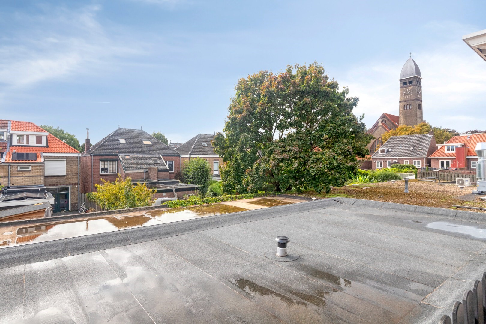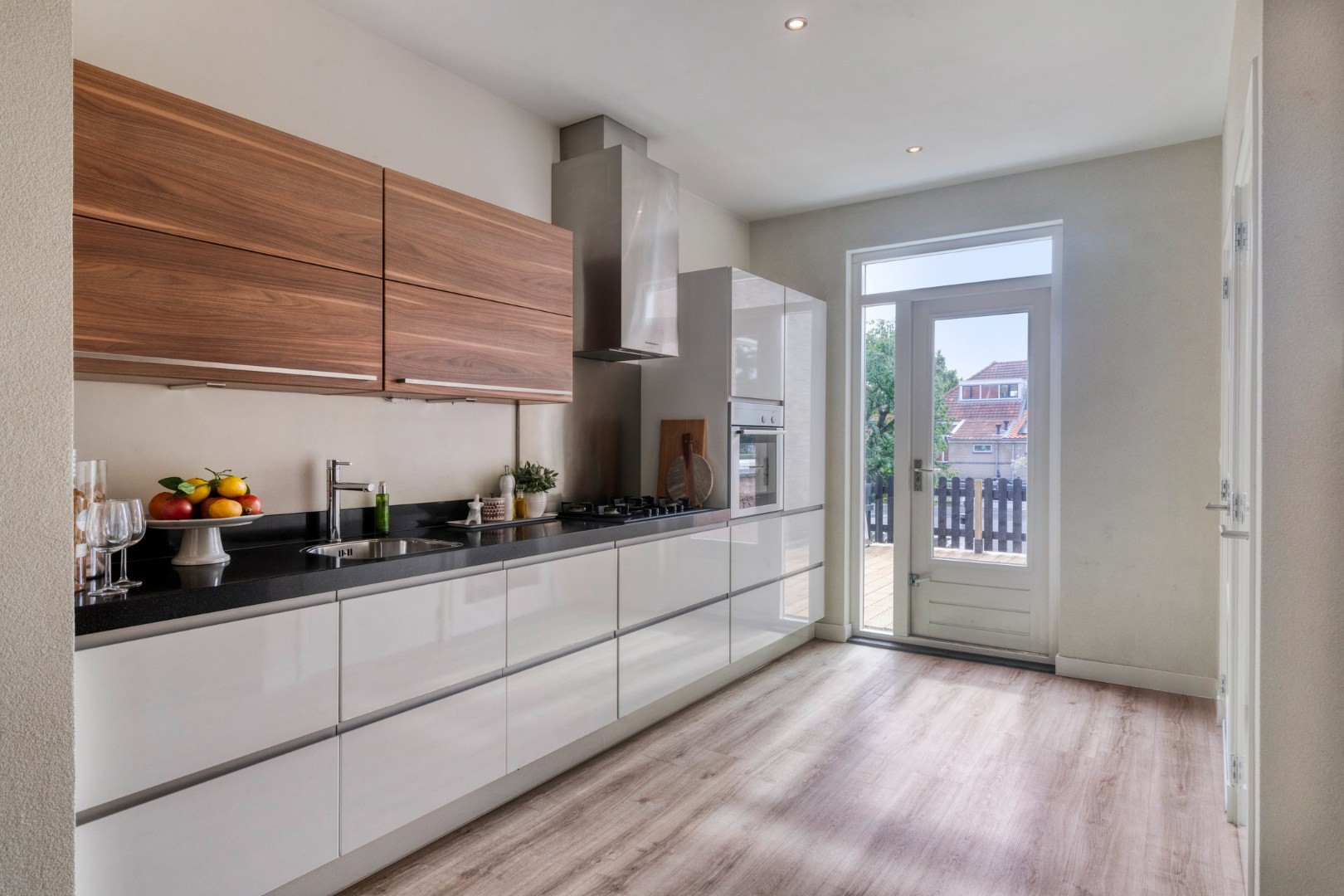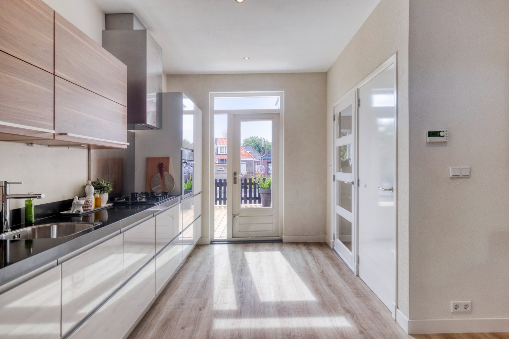 Direct grenzend aan de keuken bevindt zich de toegang tot het ruime dakterras, dat in 2025 is vernieuwd met vlonders en volledig is omheind voor optimale privacy. Hier geniet je in alle rust van de zon, de ruimte en een mooi uitzicht.