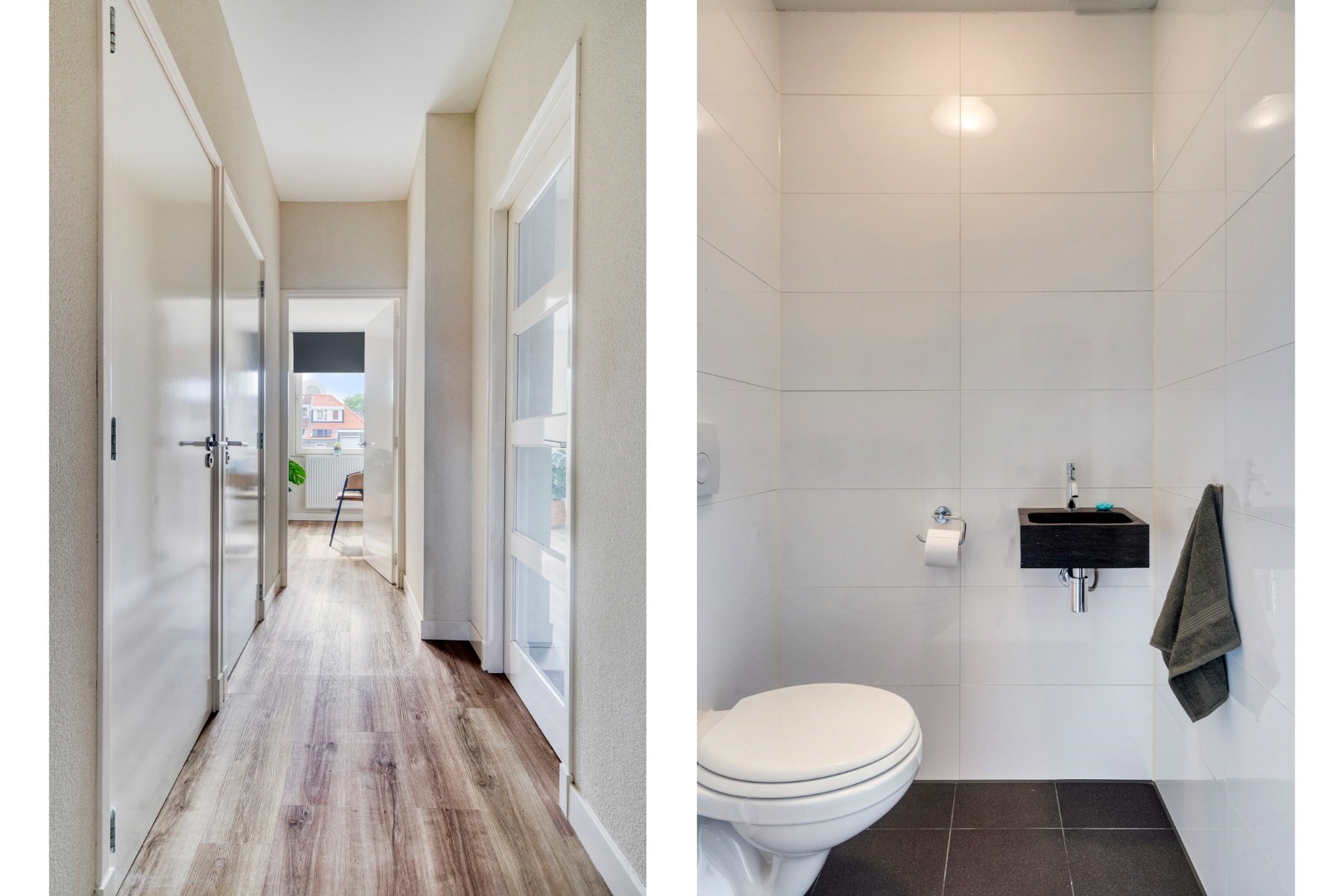 Aan de voorzijde ligt de hoofdslaapkamer: ruim en rustig gelegen. Er is een separate toiletruimte, volledig betegeld en voorzien van een hangend closet, fonteintje en mechanische ventilatie.