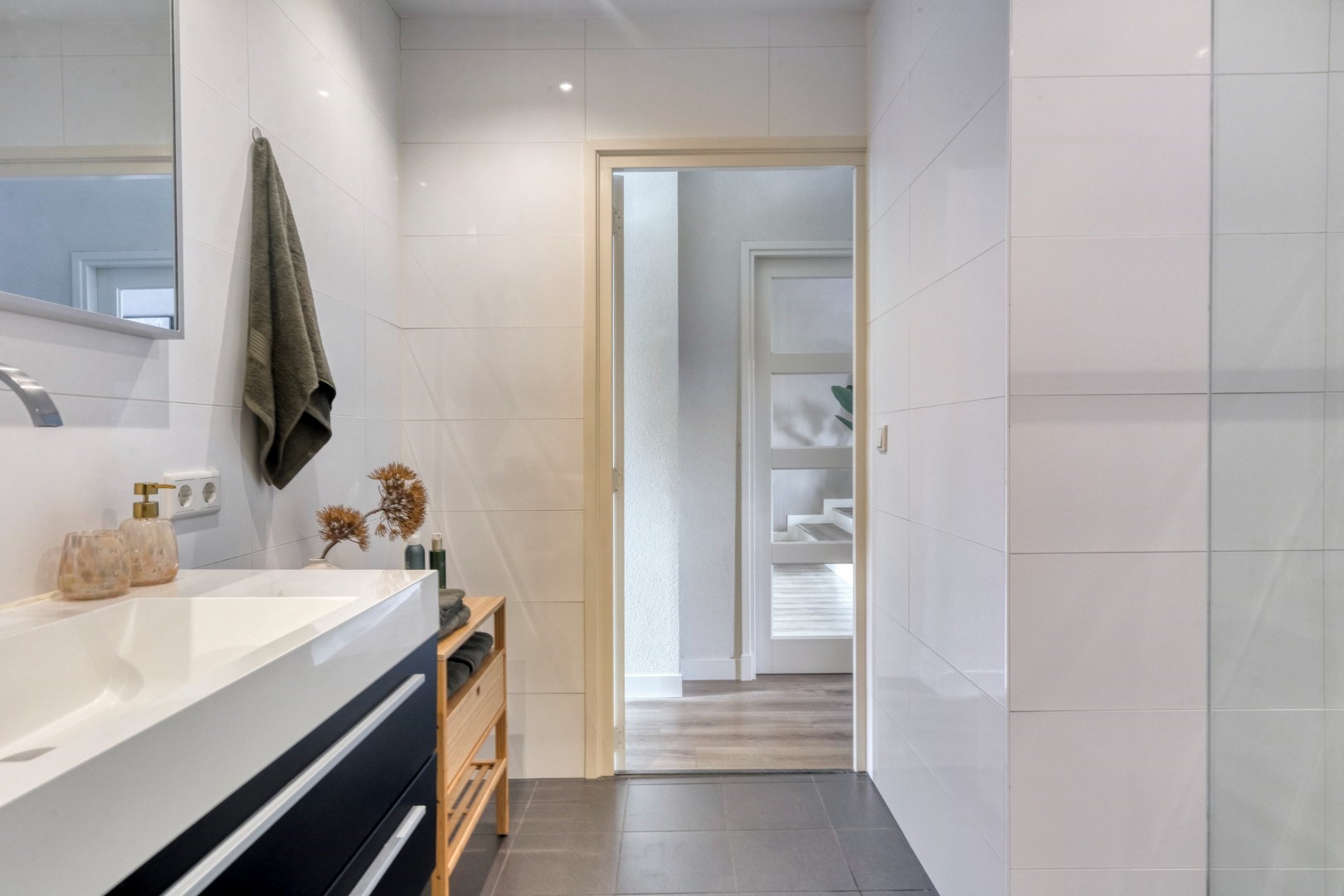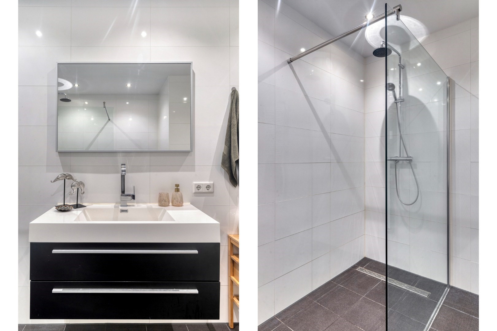 De royale badkamer is eveneens geheel betegeld en voorzien van inbouwspotjes, een inloopdouche met regendouche, een wastafelmeubel met spiegel, een designradiator en mechanische ventilatie.