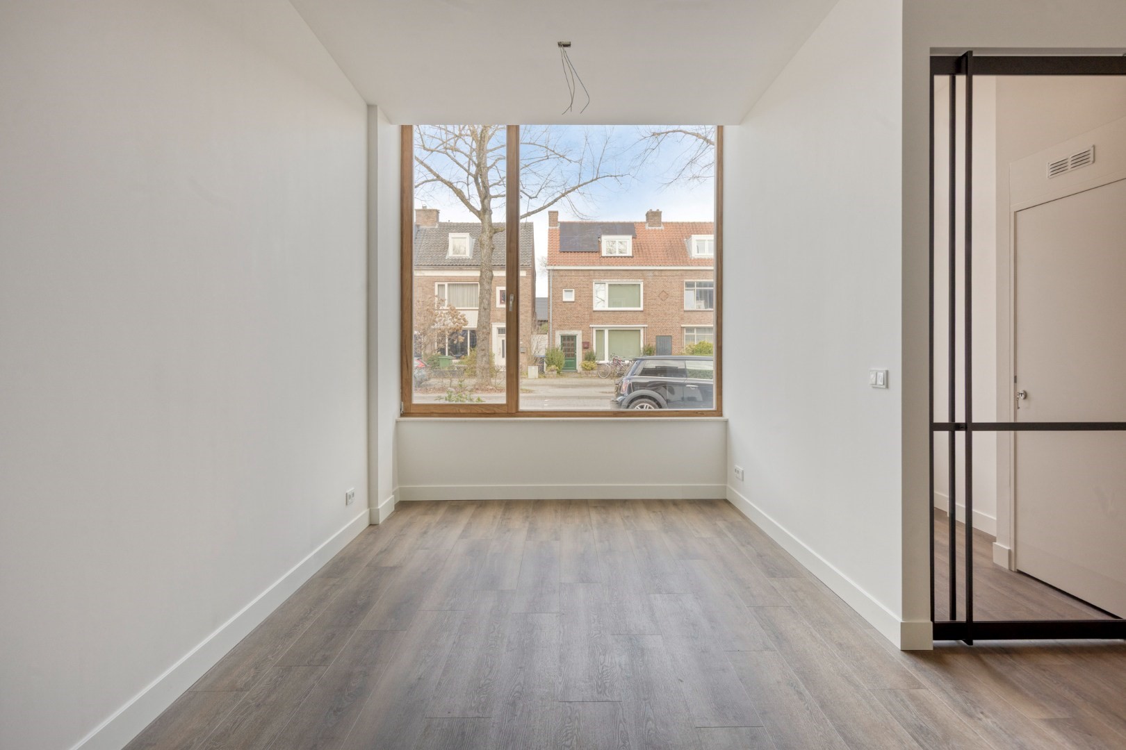 De woonkamer is bijzonder licht dankzij de grote glazen pui aan de voorzijde met kiepraam. De eerste halve meter van de pui is extra hoog uitgevoerd, wat zorgt voor een optimale toetreding van daglicht. De plafonds zijn ruim 3 meter hoog en volledig strak gestuct, wat bijdraagt aan een ruimtelijk en modern gevoel. Er is volop ruimte voor een comfortabele zithoek, tv-opstelling en een royale eethoek.