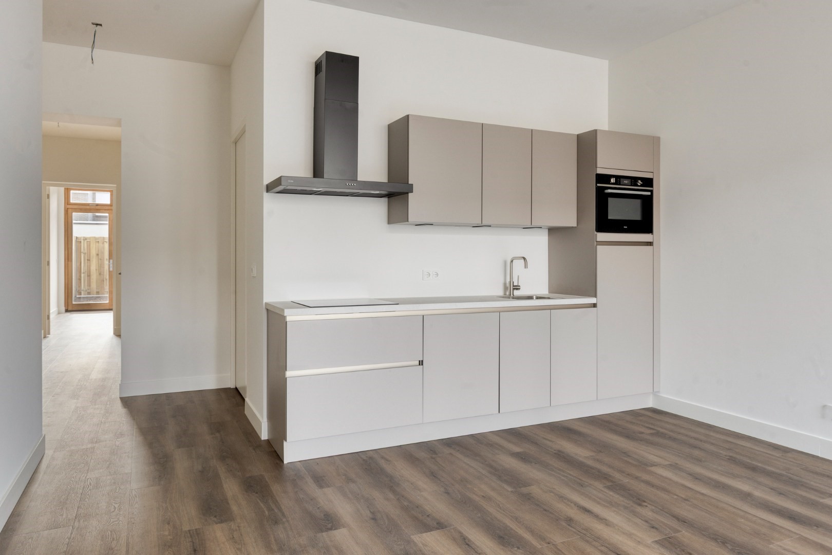 De moderne, greeploze open keuken is strak afgewerkt en voorzien van inbouwverlichting. Uitgerust met een inductiekookplaat, RVS afzuigkap met koolstoffilter, spoelbak, vaatwasser, koelkast en combi-oven, en biedt daarnaast voldoende kast- en laderuimte.