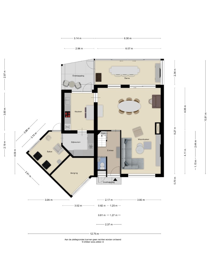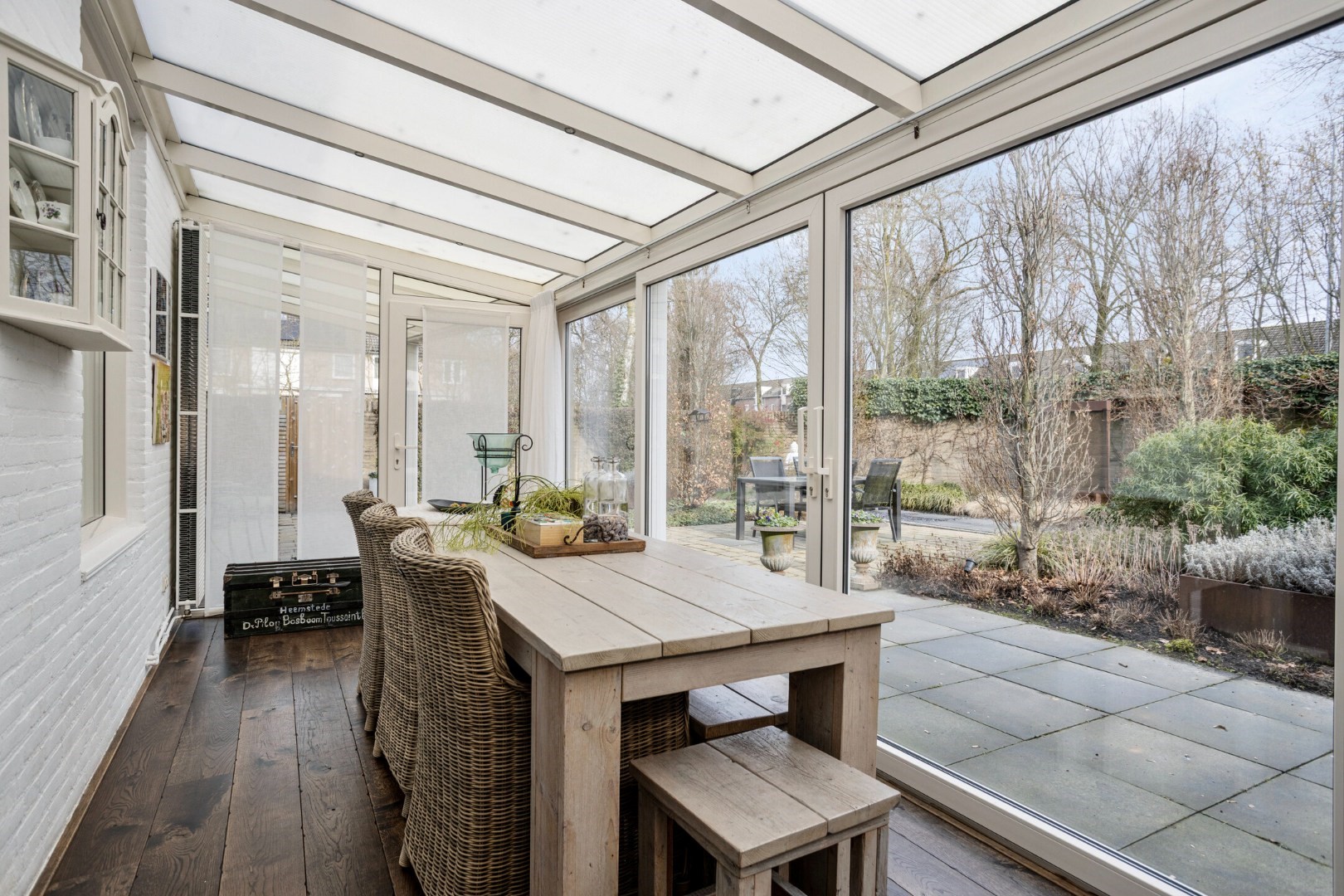Aan de achterzijde bevindt zich een convectorput en een schuifpui naar de serre. Deze serre is voorzien van inbouwspotjes en een schuifpui naar de tuin, waardoor binnen en buiten naadloos in elkaar overlopen.