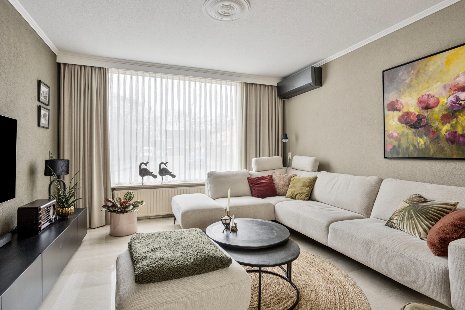 Een fraaie glazen deur (industriële look) geeft toegang tot de woonkamer. De L-vormige woonkamer kenmerkt zich door een bijzonder prettige lichtinval dankzij de hoekligging en de raampartijen. De marmeren tegelvloer, sfeervolle gashaard en airconditioning (split-unit voor zowel koelen als verwarmen) zorgen voor optimaal comfort in ieder seizoen. Aan de voorzijde geniet u van een leuk uitzicht over de rustige straat. De wanden zijn deels afgewerkt met spachtelputz en deels voorzien van een smaakvol behang.