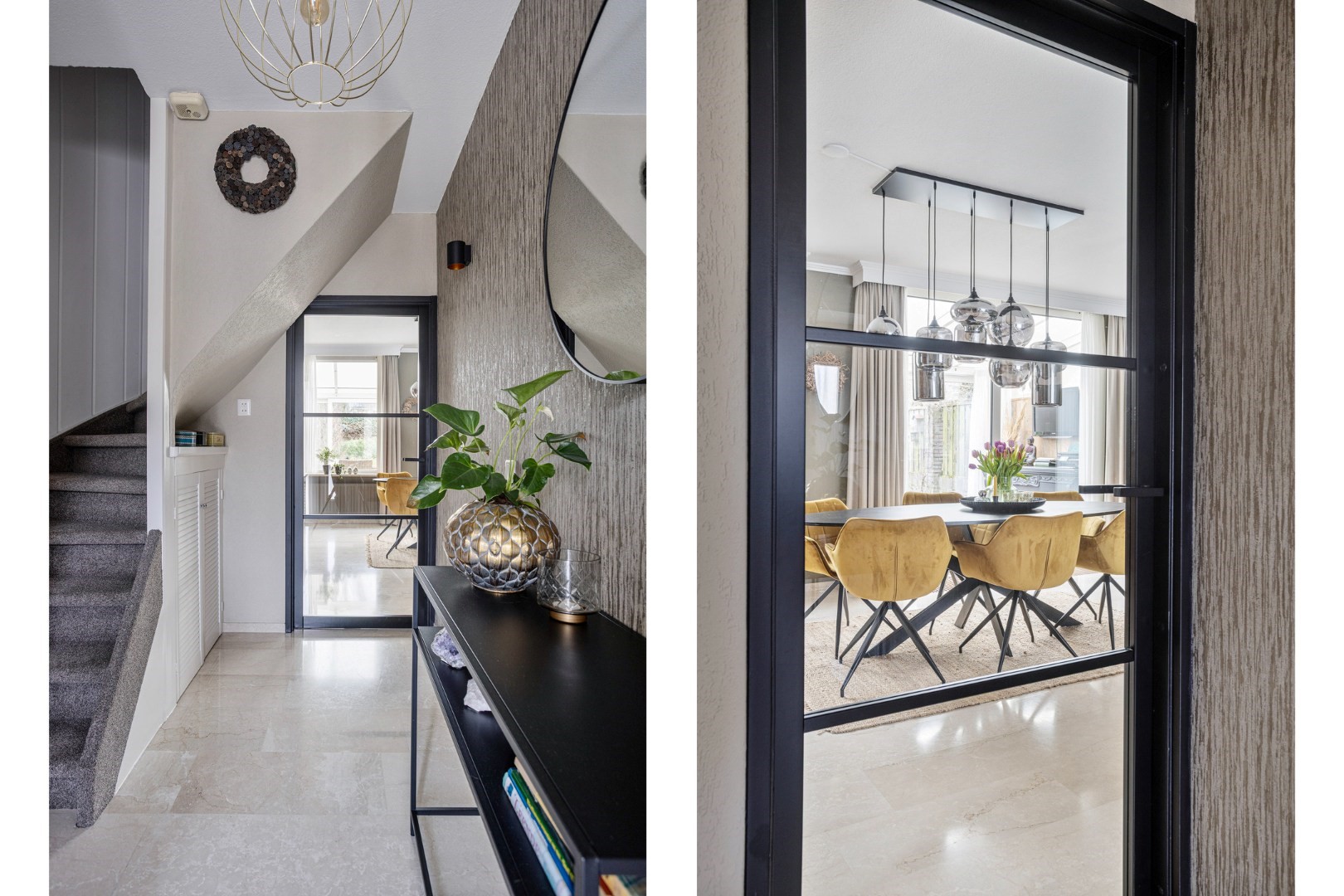 Via de overdekte entree met inbouwverlichting betreedt u deze verrassend ruime hoekwoning. Direct naast de voordeur bevindt zich de meterkast, voorzien van voldoende groepen en aardlekschakelaars. Aan de voorzijde zijn zowel op de boven- als benedenverdieping screens aangebracht, wat zorgt voor privacy en bescherming tegen de zon.
