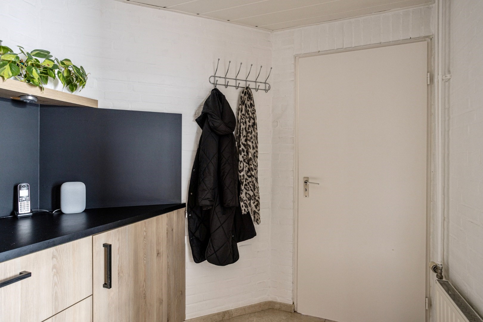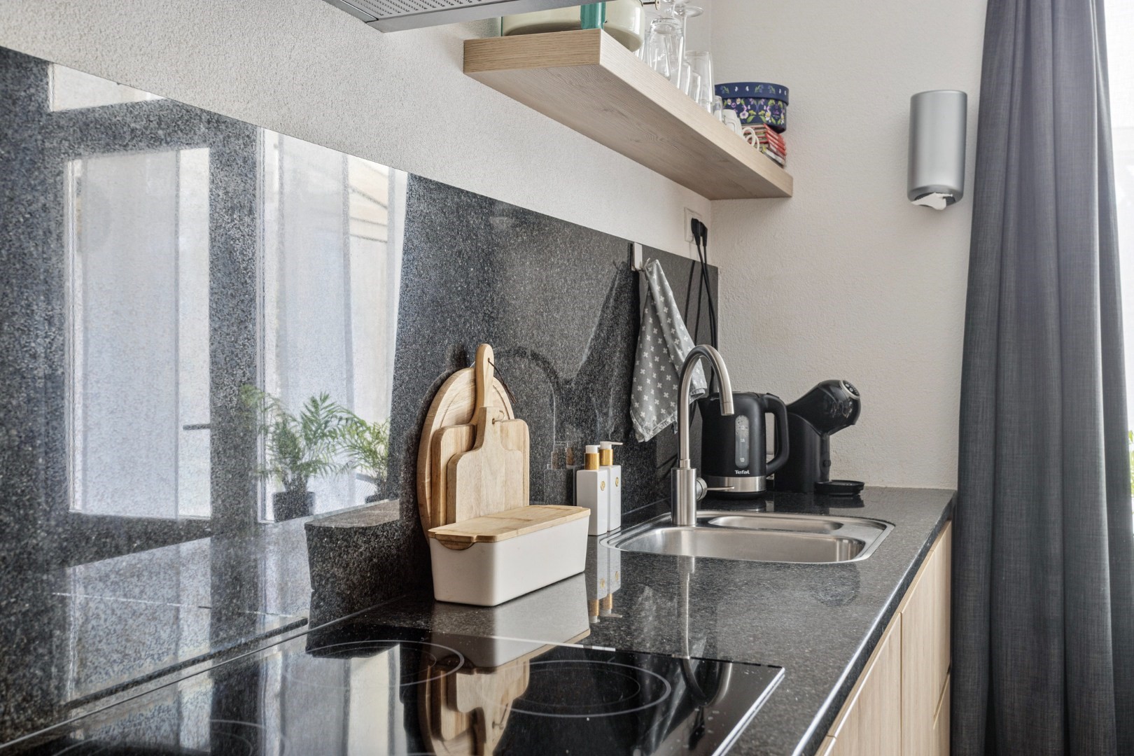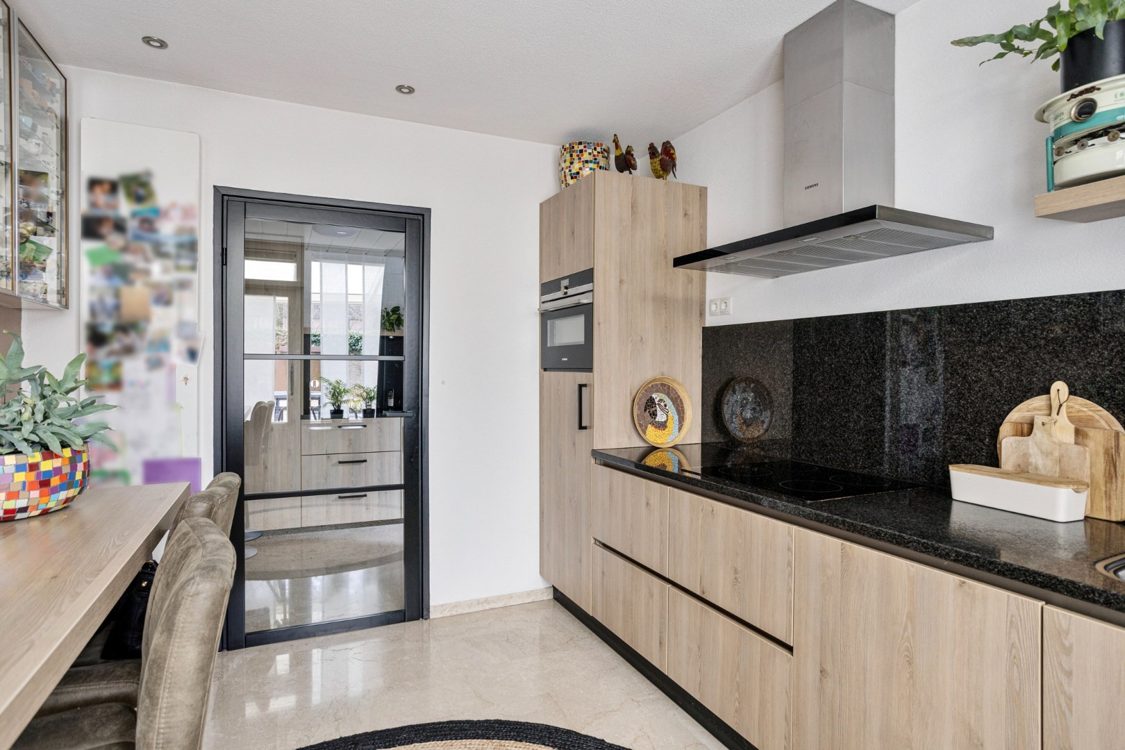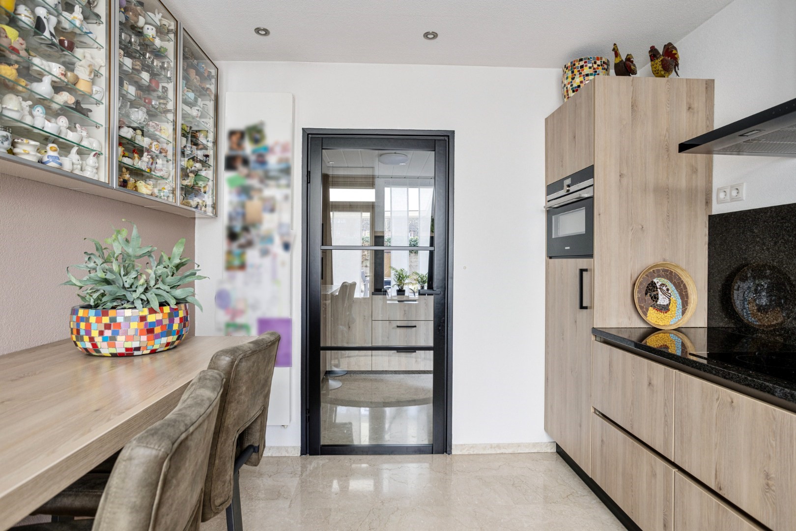 De gesloten keuken is vanuit de woonkamer bereikbaar via eenzelfde stijlvolle glazen deur. Deze ruime leefkeuken (2021) is uitgerust met een granieten werkblad, anderhalve spoelbak, vaatwasser, inductiekookplaat, vlakscherm afzuigkap, koelkast en combi-oven. Een loopdeur biedt directe toegang tot de achtertuin.