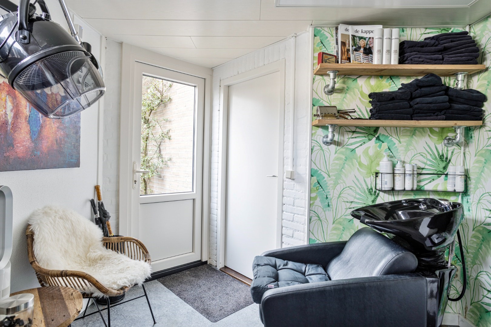 Via een derde glazen deur bereikt u de bijkeuken, die beschikt over een extra keukenblok en volop kastruimte. Aansluitend bevindt zich een multifunctionele praktijkruimte met inbouwspotjes, een onderhoudsvriendelijke vinyl-vloer en een eigen ingang.