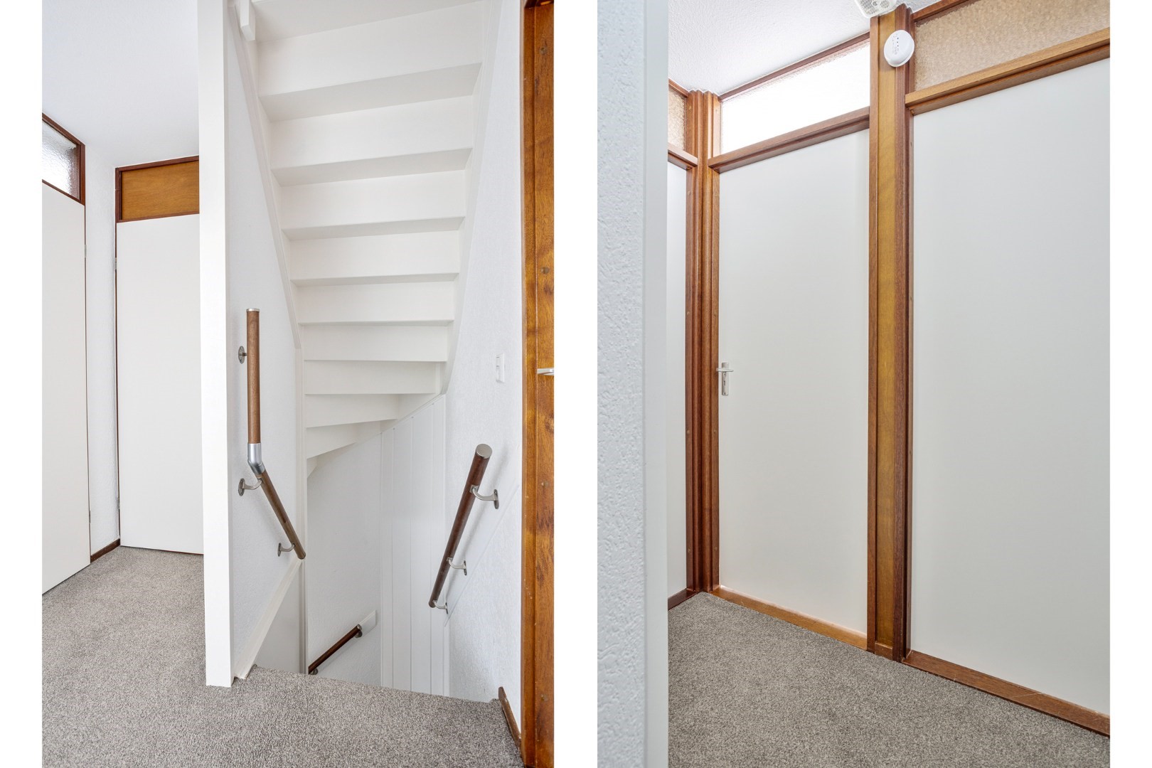 Via een vaste trap bereikt u de tweede verdieping. De overloop is voorzien van vloerbedekking en beschikt over vaste kasten onder de knieschotten, wat zorgt voor praktische bergruimte.