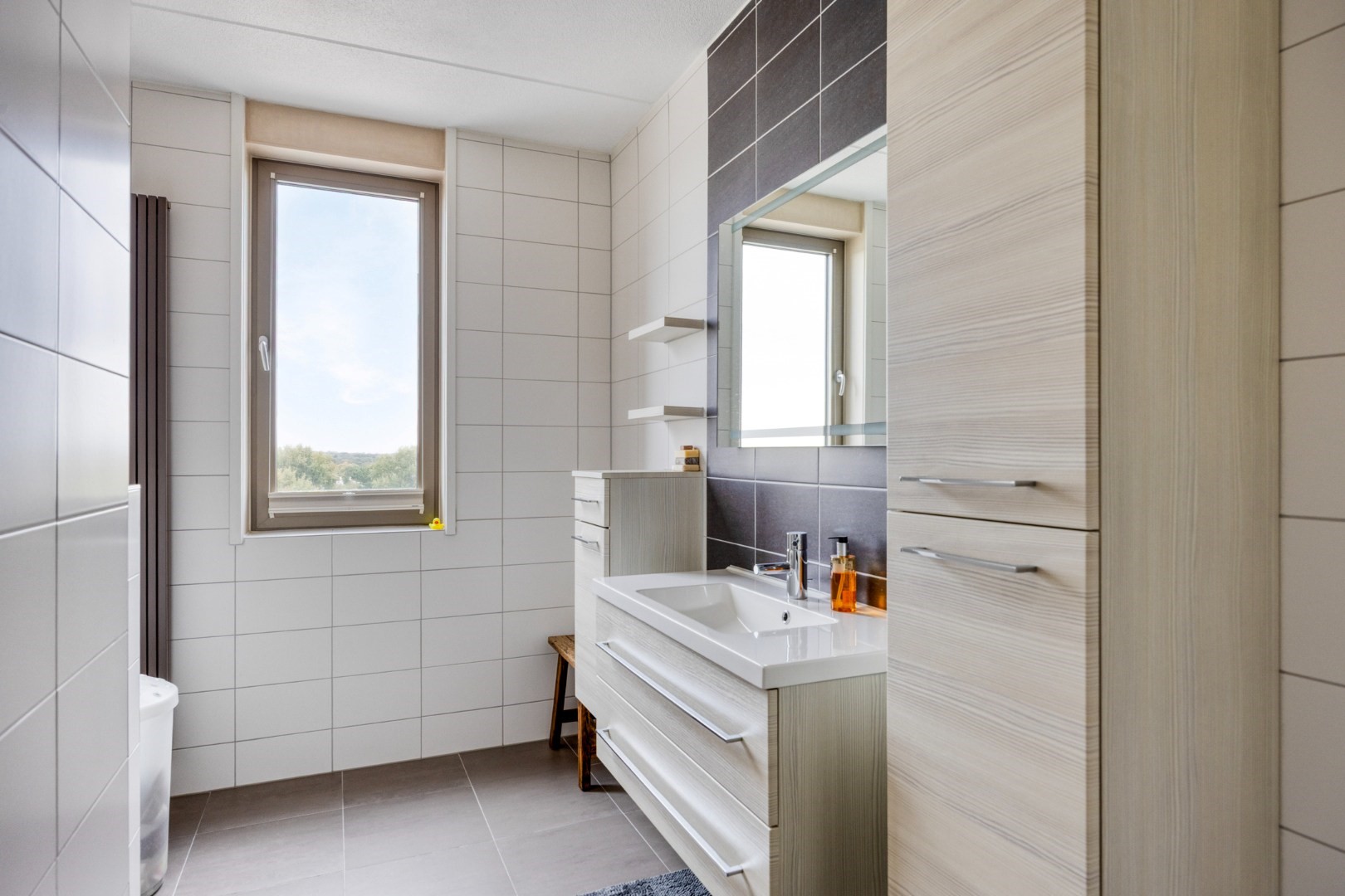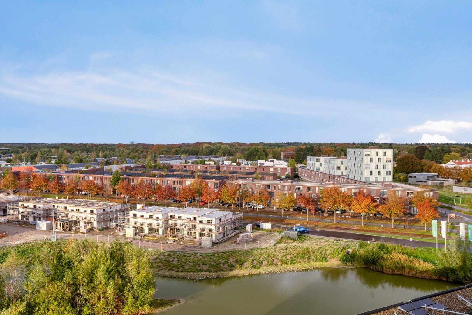 De woonkamer is heerlijk licht dankzij de grote ramen aan twee zijden. Vanuit hier heb je een prachtig uitzicht over een parkachtige omgeving met water, groen en wandelroutes.