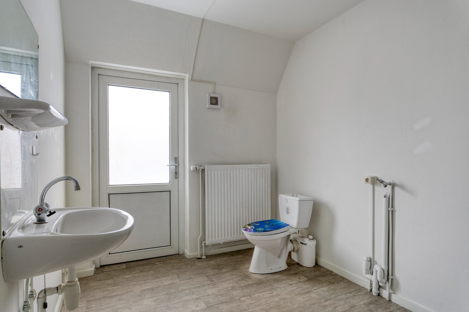 Daarnaast is er een royale badkamer aanwezig. Deze is uitgerust met een staand toilet met sanibroyeur (vermaler), een vaste wastafel en een douchecabine met thermostaatkraan. Dankzij de ruimte biedt ook de badkamer diverse indelingsmogelijkheden. Vanuit de badkamer is ook het royale dakterras te bereiken.
