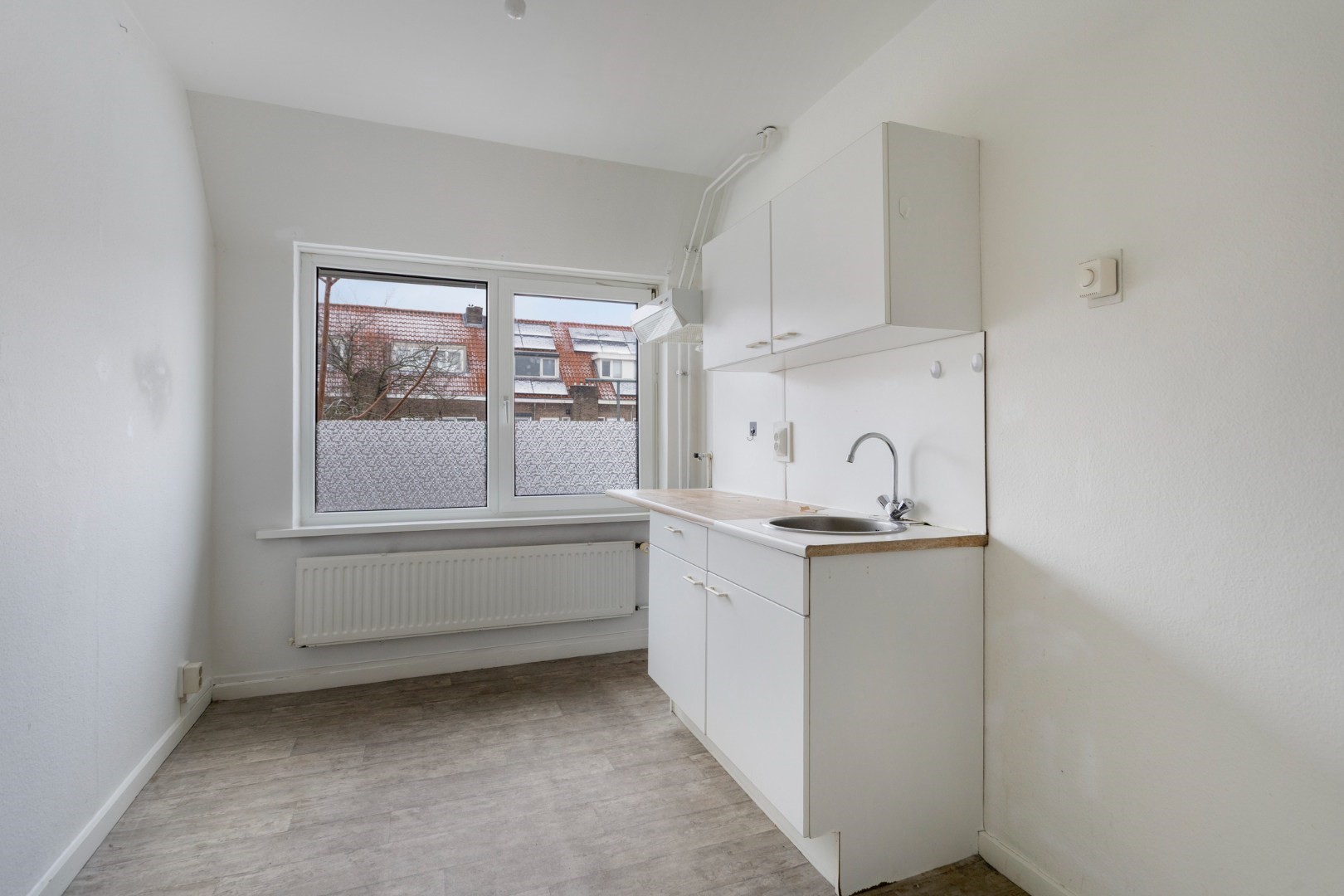Aan de achterzijde vindt u de eenvoudige maar ruime keuken. De keuken is voorzien van een praktisch keukenblok met kastruimte, spoelbak, gasaansluiting ten behoeve van een gasfornuis en een afzuigkap. Een fijne basis om desgewenst te moderniseren.
