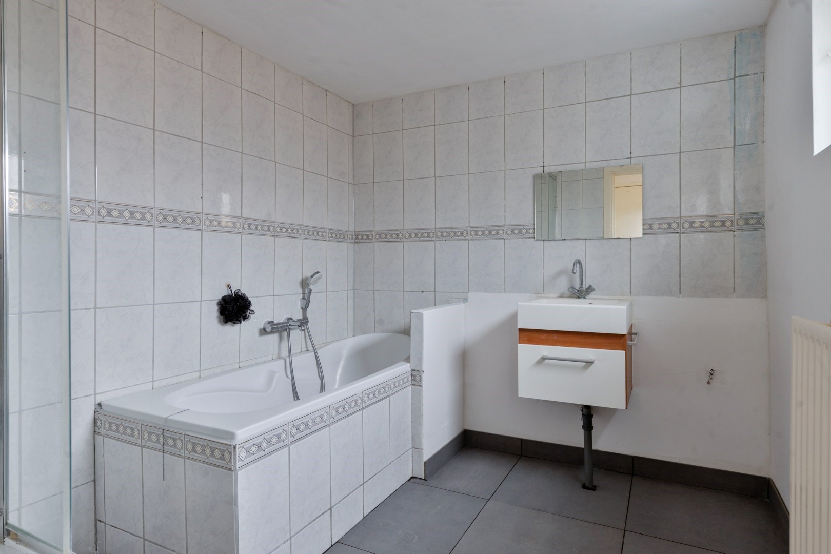 Het portaal aan de achterzijde biedt toegang tot de achterdeur en tot de royale badkamer. De badkamer is volledig betegeld en compleet uitgevoerd met een douchehoek voorzien van thermostaatkraan, een ligbad met thermostaatkraan en een vaste wastafel in meubel. Vanuit de badkamer is tevens de separate toiletruimte bereikbaar.