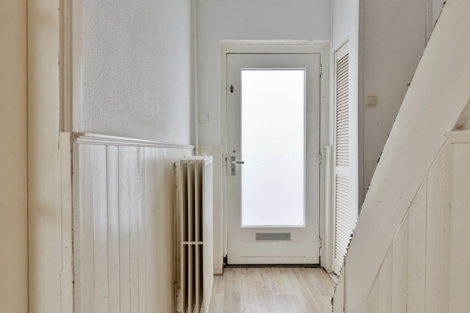 Via de hal betreedt u de woning, waar direct de prettige lichtinval opvalt. De hal is voorzien van een doorlopende laminaatvloer die zorgt voor een rustige en uniforme uitstraling. In de praktische kelderkast bevindt zich tevens de meterkast met 5 groepen en 2 aardlekschakelaars.