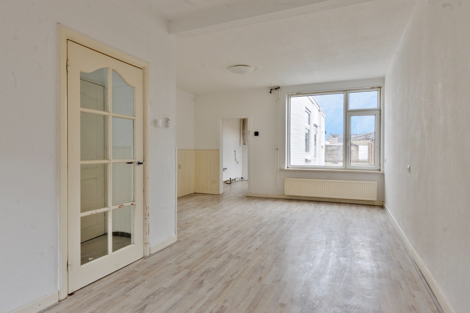 Vanuit de hal geeft een deur met glas toegang tot de sfeervolle woonkamer. Dankzij de karakteristieke erker aan de voorzijde geniet deze ruimte van veel natuurlijke lichtinval en een prettige ruimtelijke beleving. De wanden en plafonds zijn afgewerkt met spuitwerk, wat zorgt voor een prima en moderne basis. In een gedeelte van de woonkamer bevindt zich een houten lambrisering.