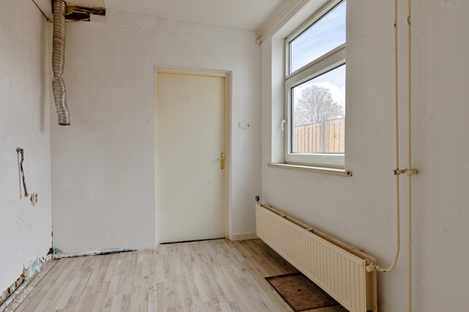 Aansluitend bevindt zich de keukenruimte. Deze is momenteel zonder keukeninrichting, waardoor u als koper de unieke mogelijkheid heeft om deze volledig naar eigen smaak en wens in te richten. In de keuken bevindt zich ook de c.v.-combiketel (merk Nefit).
