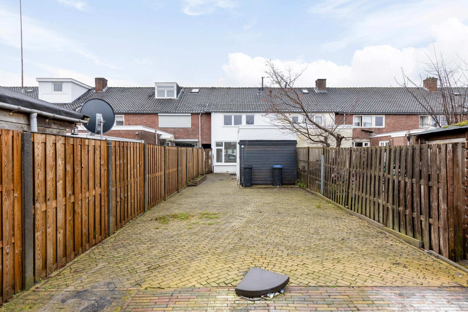 De diepe achtertuin is volledig omheind en voorzien van sierbestrating, wat zorgt voor een onderhoudsvriendelijke buitenruimte met volop mogelijkheden voor een gezellige zithoek of terras. De karakteristieke achterom bevindt zich tussen deze woning en de naastgelegen woning en is aan de voorzijde bereikbaar via een gezamenlijke poort. De achtertuin grenst aan een garageplein, wat mogelijkheden biedt voor het realiseren van een carport, een ruime berging of een garage (na het verkrijgen van een eventueel recht van overpad).