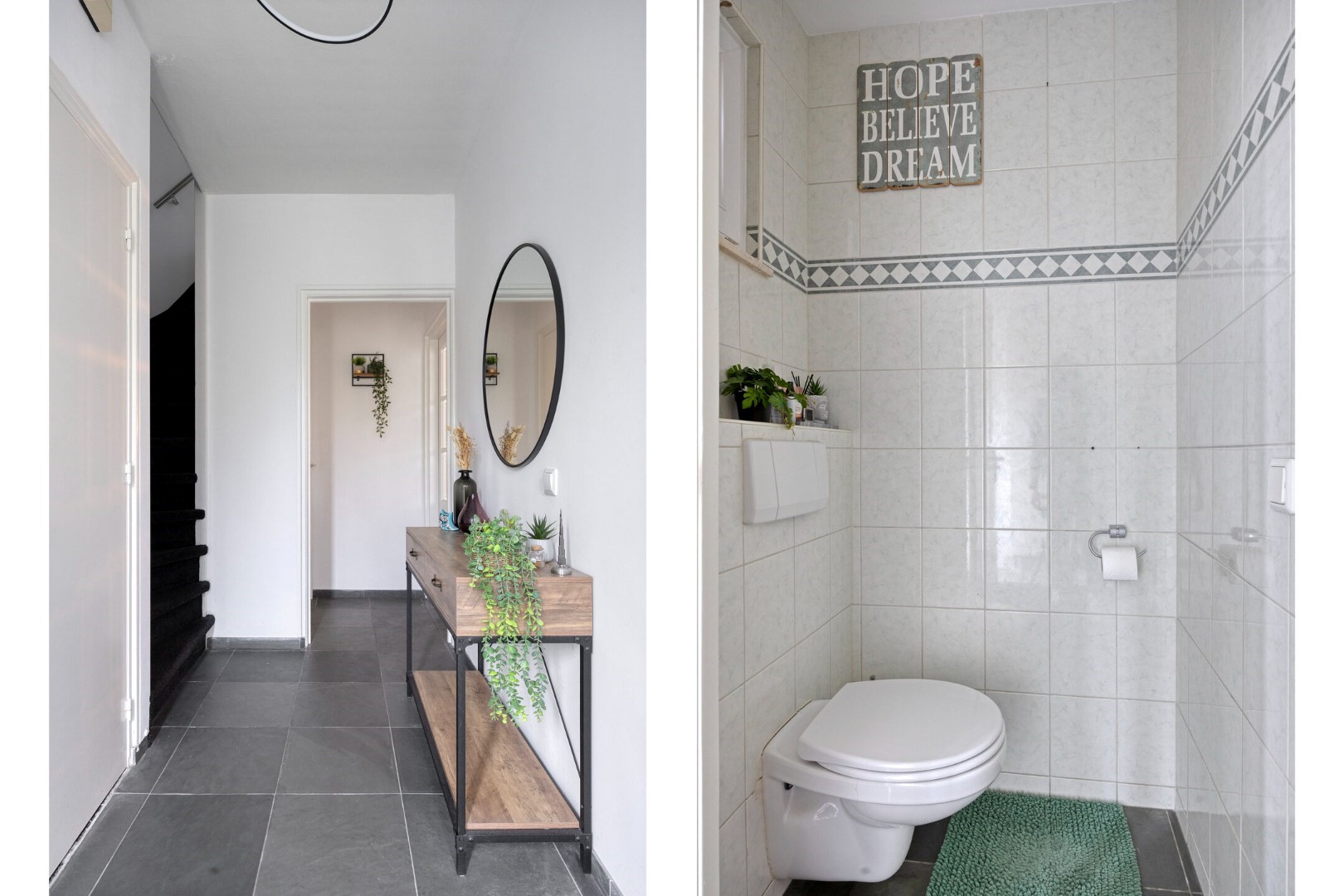 Vanuit de hal is er toegang tot een toilet met vrijhangend closet en lichte betegeling, evenals tot de meterkast en de provisiekast.