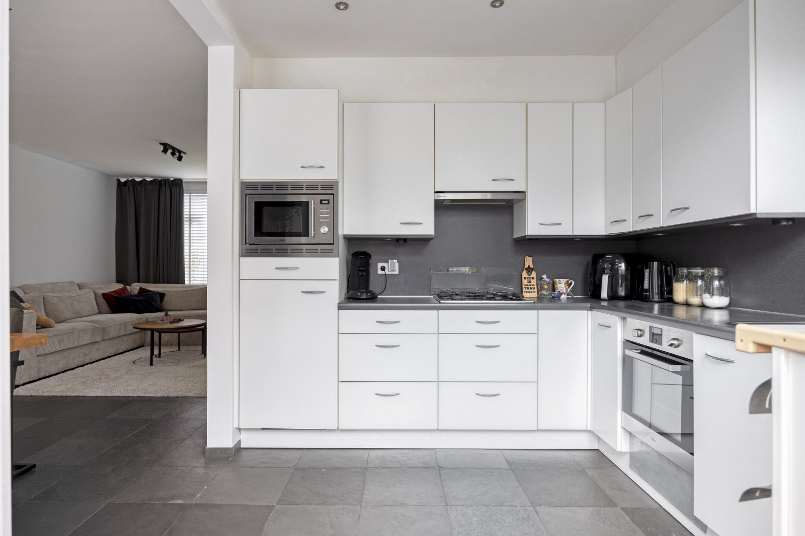 De woonkamer is een ruime doorzonwoning, met aan de voorzijde voldoende plek voor een comfortabele zithoek en aan de achterzijde ruimte voor bijvoorbeeld een grote eettafel. De neutrale tegelvloer geeft het geheel een moderne uitstraling.