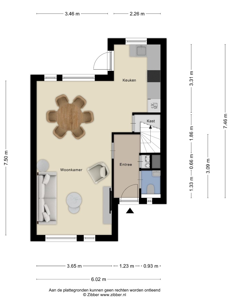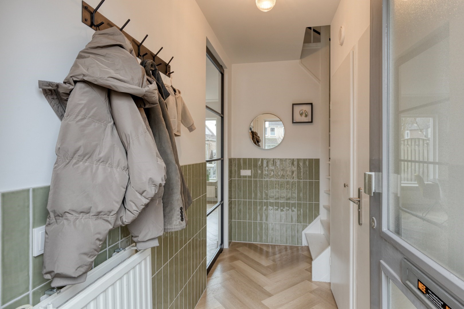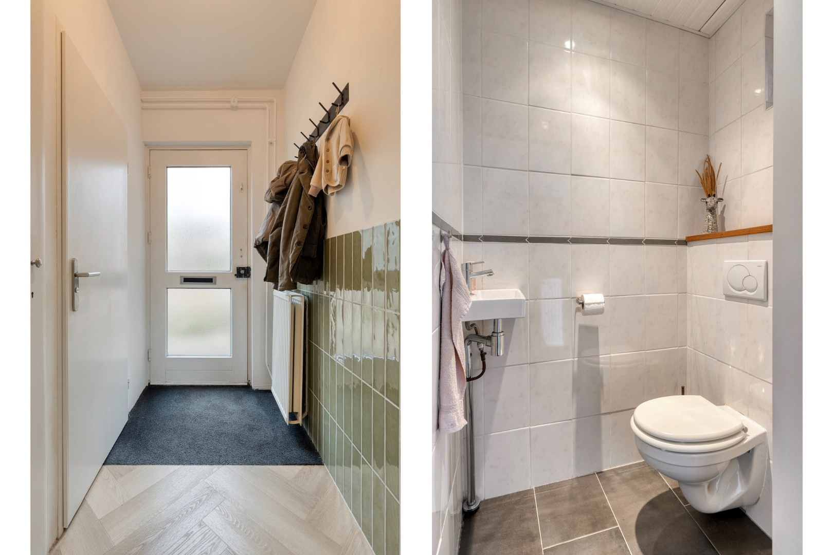 Via de hal betreedt u de woning en valt direct de betegelde lambrisering op. De in visgraat gelegde pvc-vloer loopt over de gehele begane grond door en zorgt voor een warme, moderne uitstraling. De meterkast beschikt over 9 elektragroepen en 2 aardlekschakelaars, volledig voorbereid op hedendaags wooncomfort.