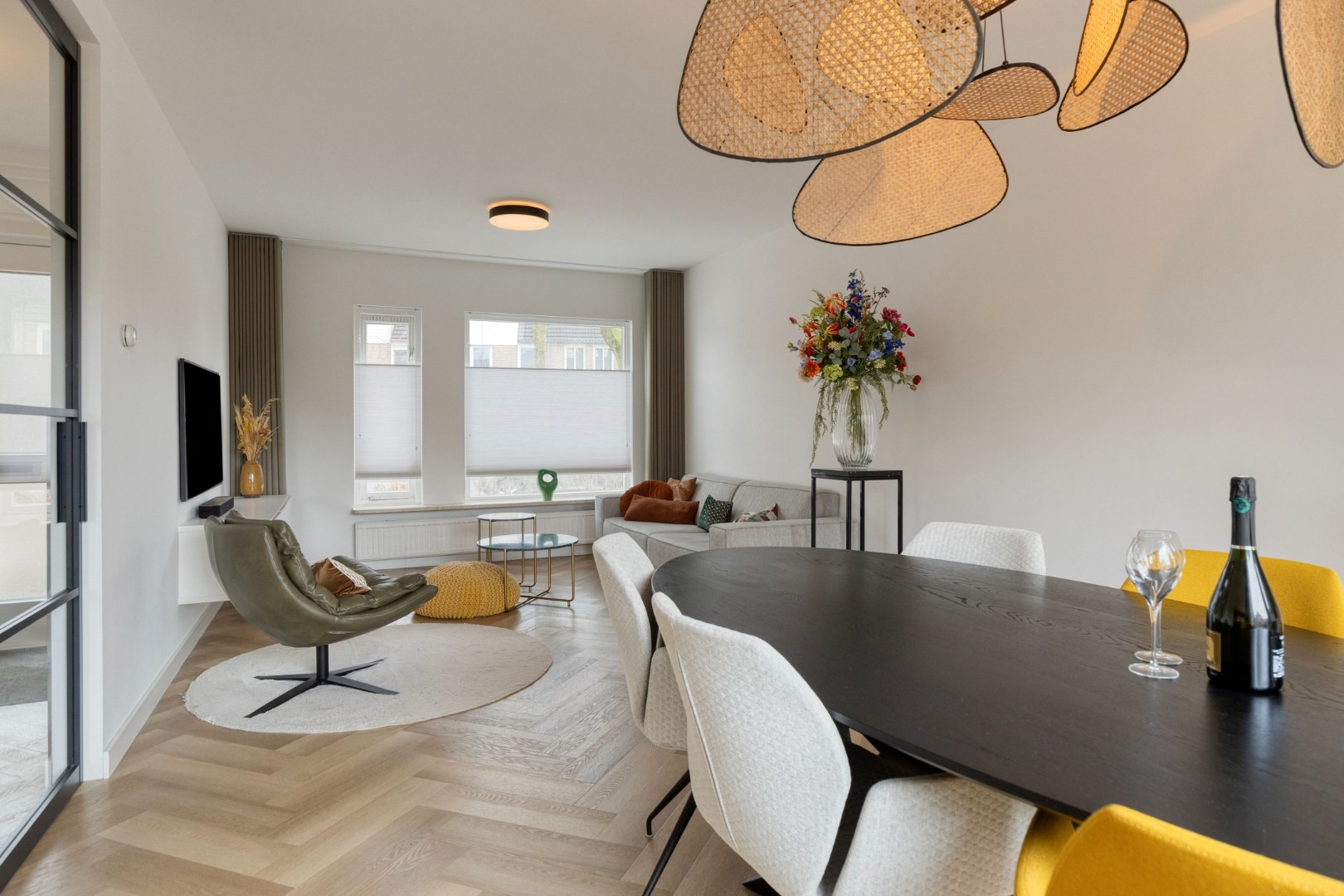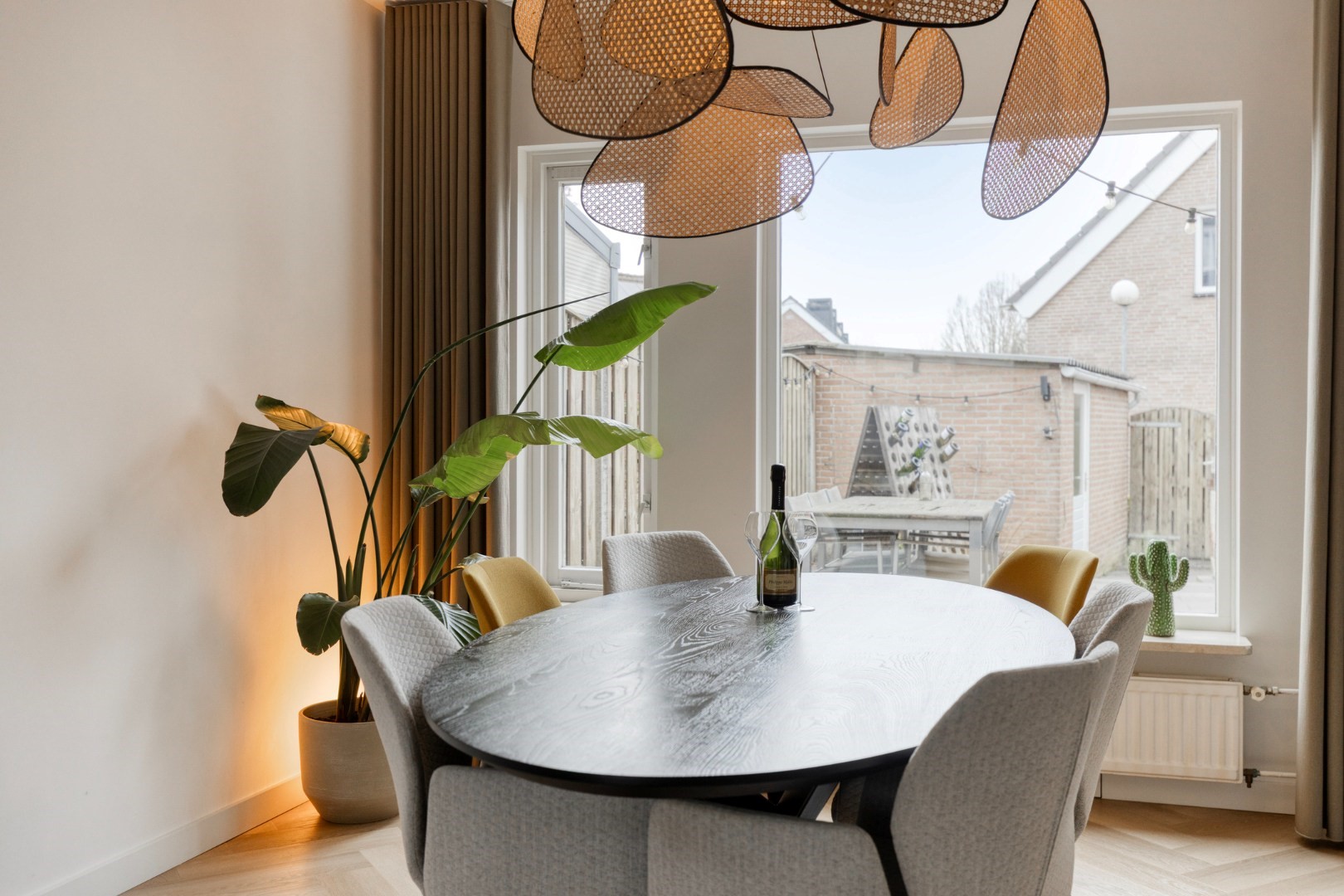 Aan de achterzijde bevindt zich de open keuken met praktische trapkast. De luxe L-vormige keuken is uitgevoerd met matzwarte keukenkasten en een stijlvol composieten werkblad. De keuken is compleet uitgerust met een zwarte spoelbak, Quooker, heteluchtoven, vaatwasser, inductie kookplaat en koelkast. Via de achterdeur bereikt u de achtertuin.