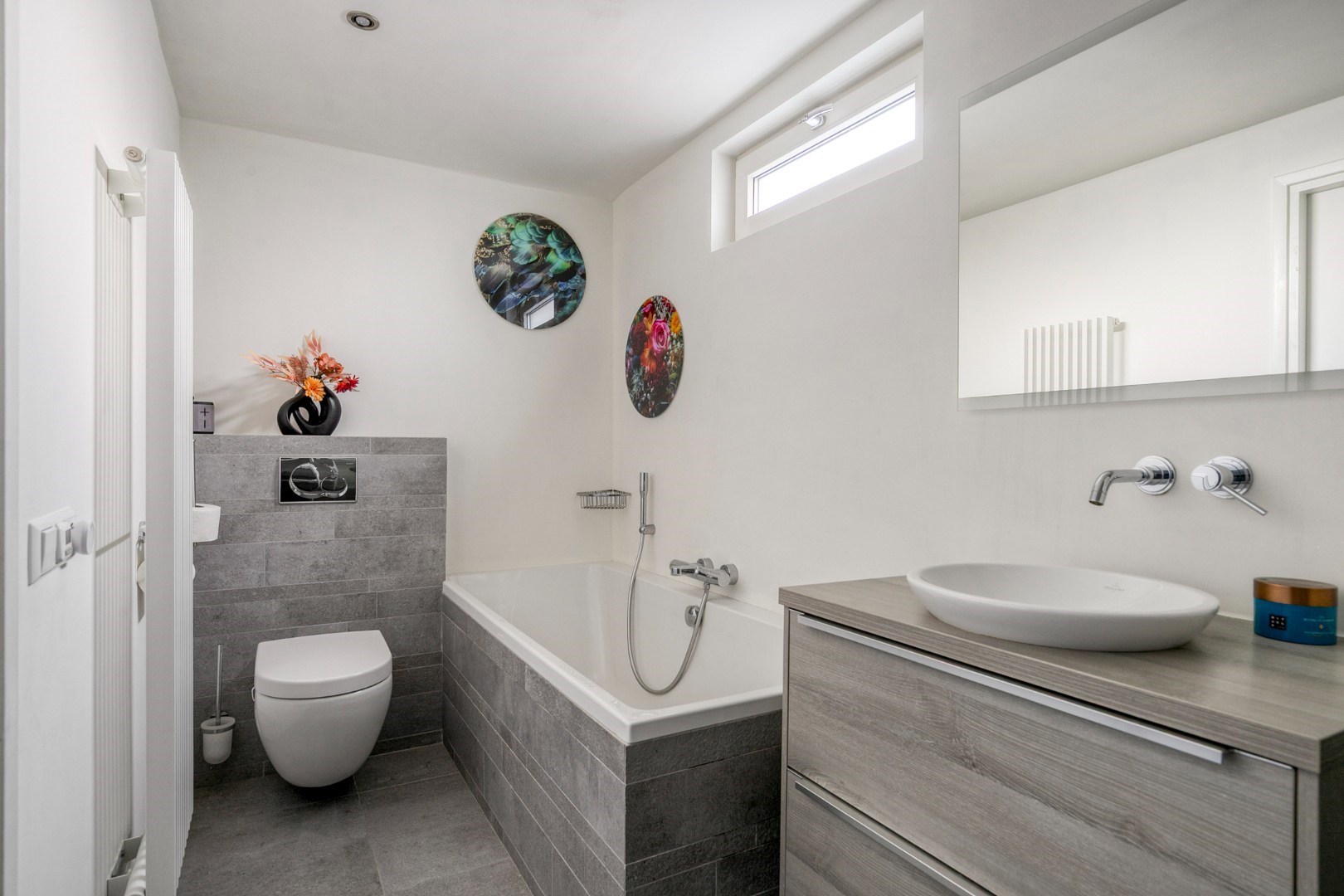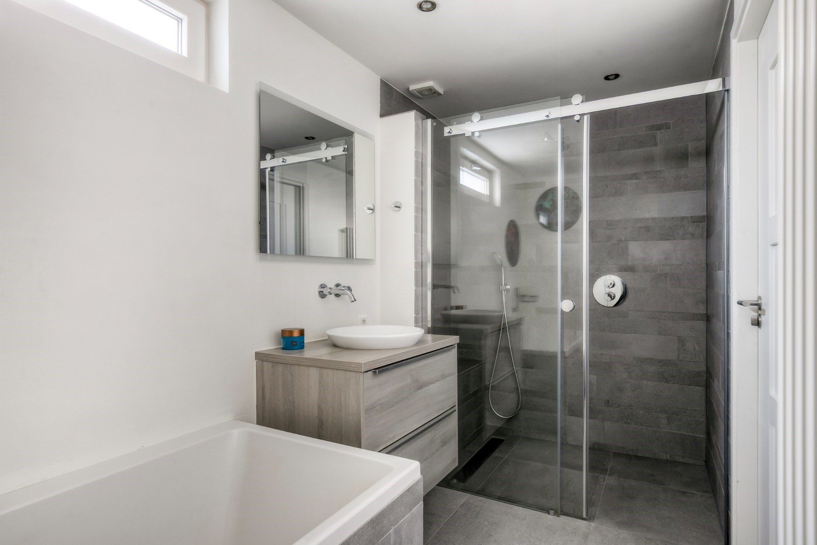 De badkamer is voorzien van tegelwerk in de douchecabine, bij de badwand, rondom de toiletombouw en op de vloer. De overige wanden zijn afgewerkt met stucwerk. De ruimte is uitgerust met een inloopdouche met ingebouwde thermostaatkraan en regendouche, een ligbad met thermostaatkraan, een wastafel met meubel en spiegel met verlichting, en een designradiator.