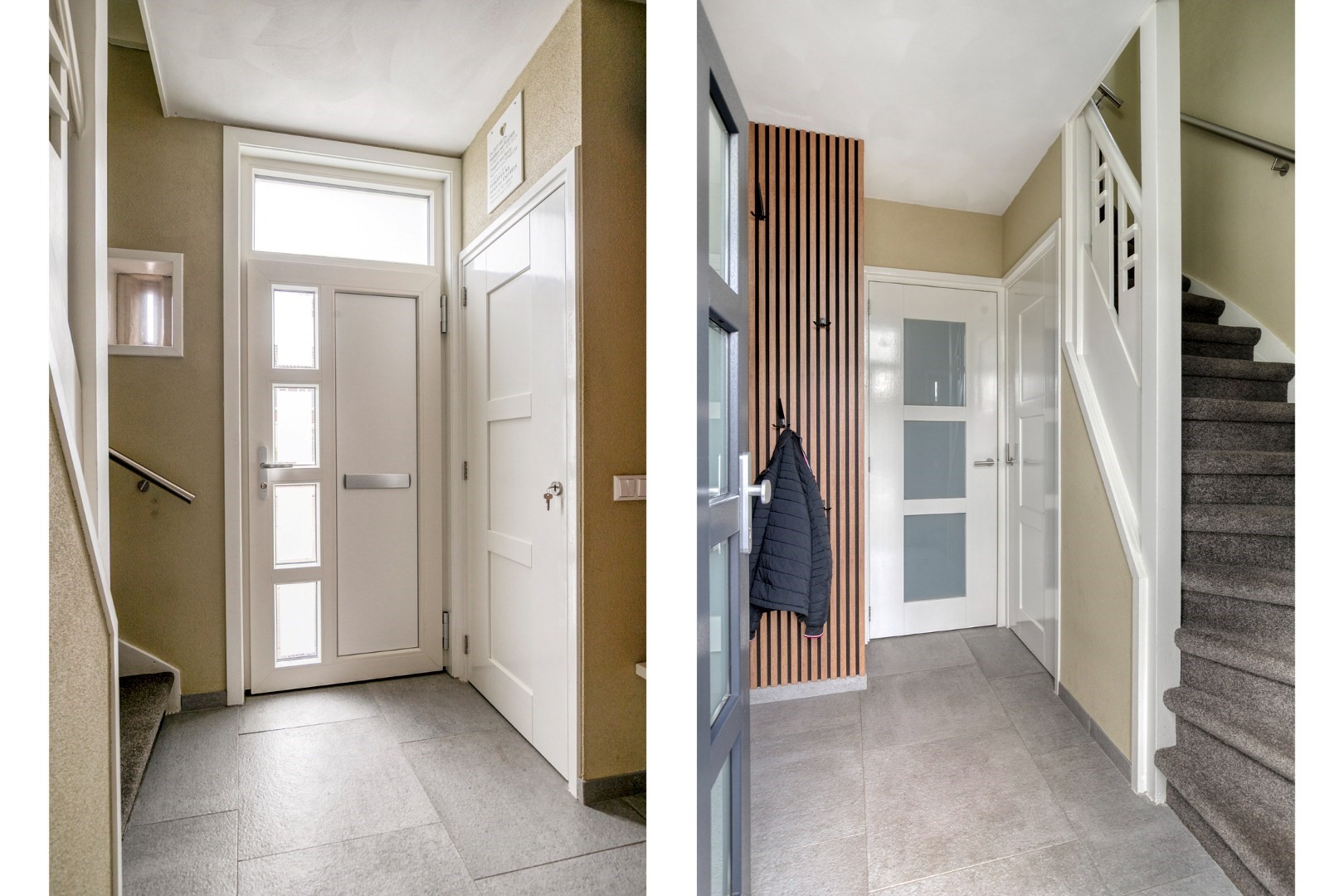 Via de oprit bereikt u de entree van de woning. In de ontvangsthal ligt een doorlopende tegelvloer met vloerverwarming. De hal met garderobenis biedt toegang tot de moderne meterkast (voorzien van 12 groepen, 3 aardlekschakelaars en de unit ten behoeve van de vloerverwarming), de praktische kelderkast en de keuken/woonkamer.