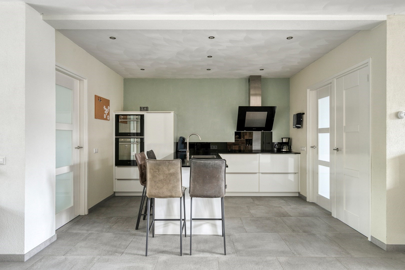 De complete keuken is luxe uitgevoerd en voorzien van een bar met composieten werkblad, een spoeleiland, vaatwasser, 5-pits inductiekookplaat, rvs-afzuigschouw en een extra kastenwand met koelkast, combi- magnetron en aparte oven. Daarnaast beschikt de keuken over inbouwspotjes en een handige inbouwkast.