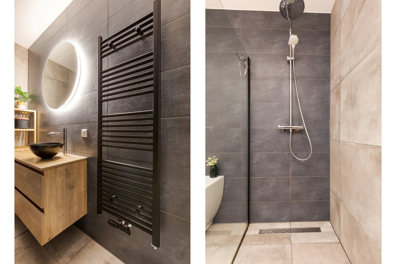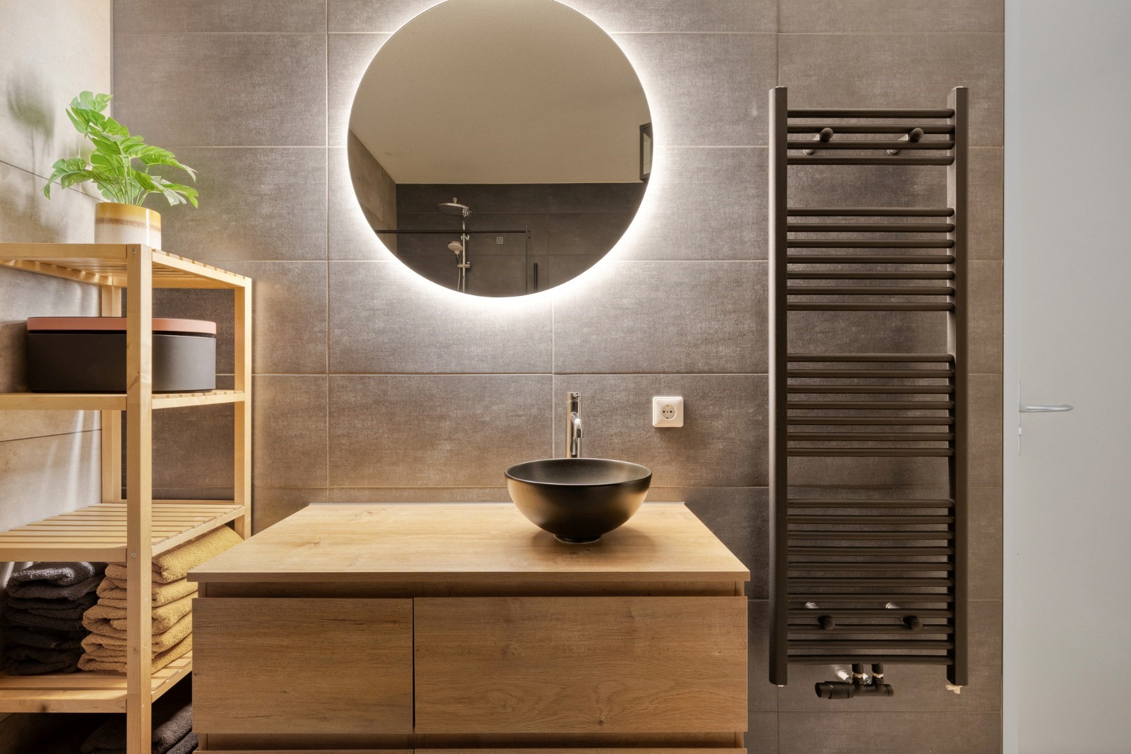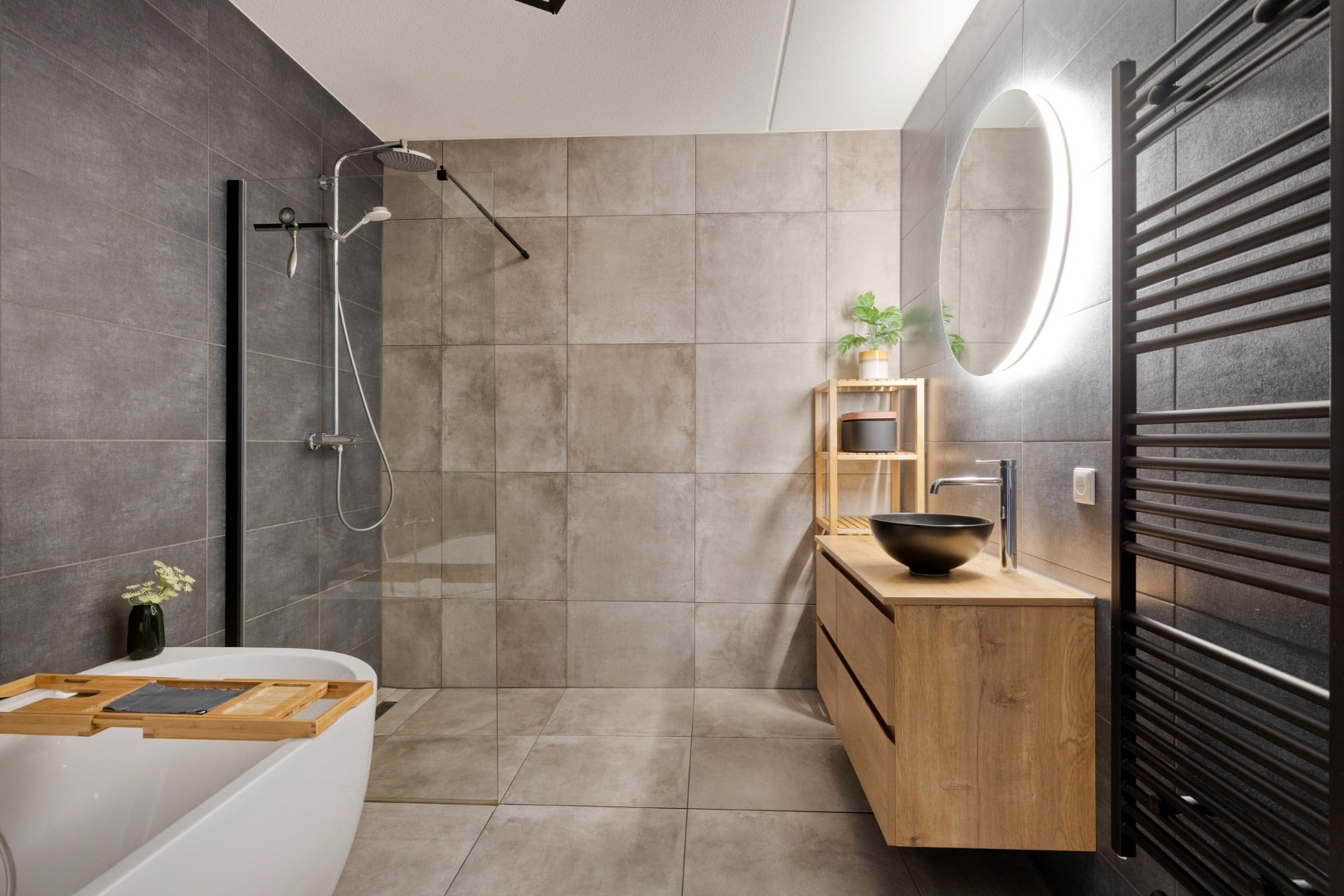 De in 2021 volledig vernieuwde en geheel betegelde badkamer ademt exclusiviteit. U vindt hier een design ovaal ligbad, een royale inloopdouche met regendouche en glazen douchewand, een luxe badmeubel met een design waskom, een ronde spiegel met geïntegreerde verlichting en een stijlvolle designradiator. Een ruimte waar comfort en esthetiek perfect samenkomen.