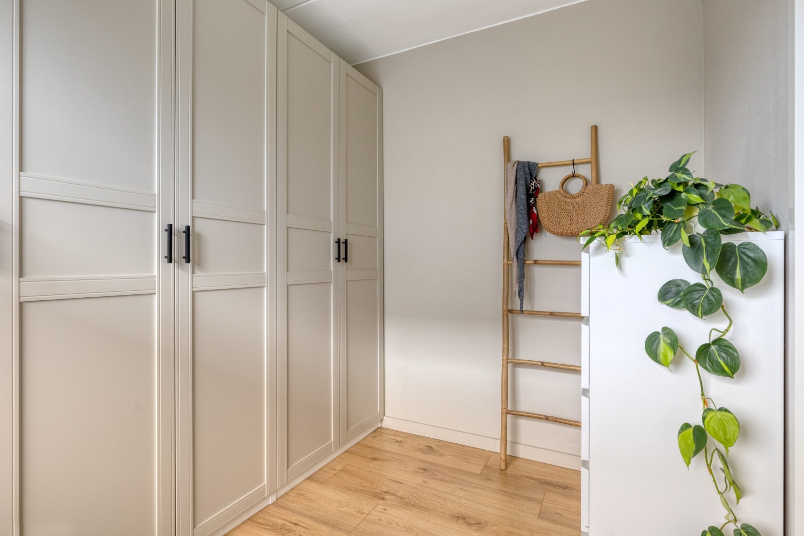 Aan de voorzijde bevindt zich een comfortabele kleinere slaapkamer, ideaal als kinder-, werk- of logeerkamer. Deze kamer is voorzien van een rolluik, wat zorgt voor extra privacy en een aangenaam slaapklimaat.